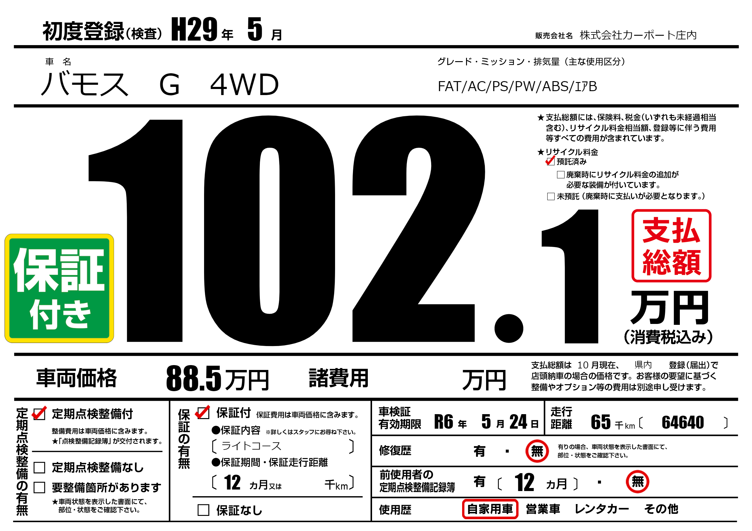 | 車名 | バモス G 4WD | グレード ミッション 排気量 |