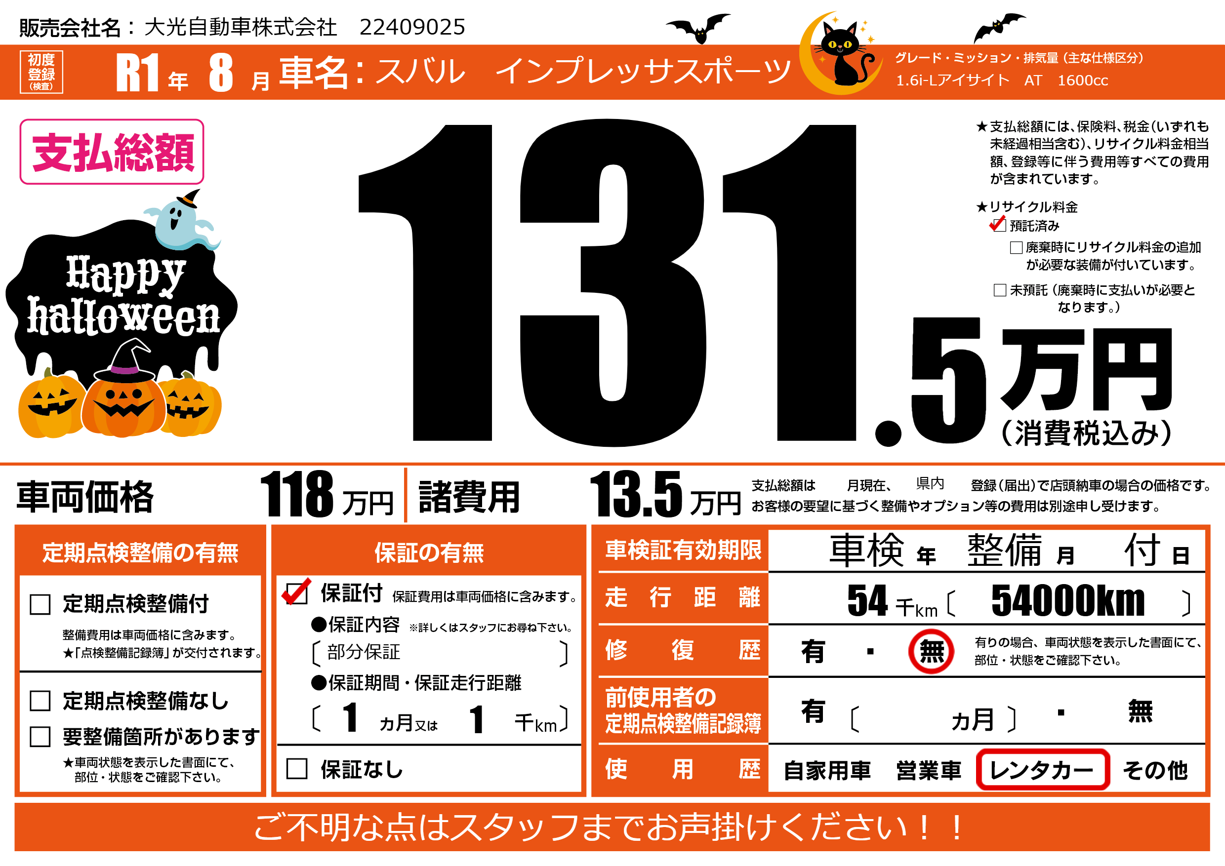 | 走行キロ | 5.4万km | 初年度登録 | R1年8月 |