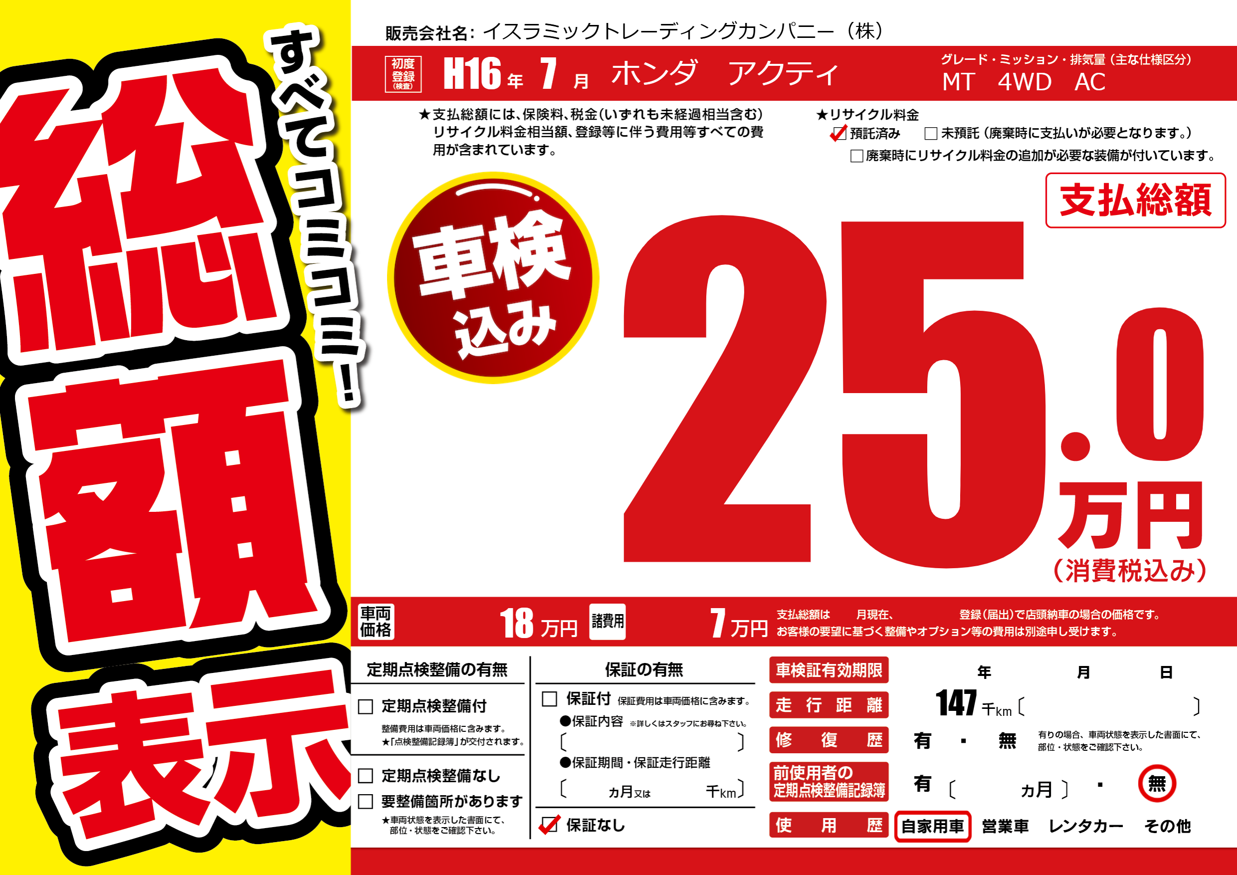 | 車名 | ホンダ アクティ | グレード ミッション 排気量 |
