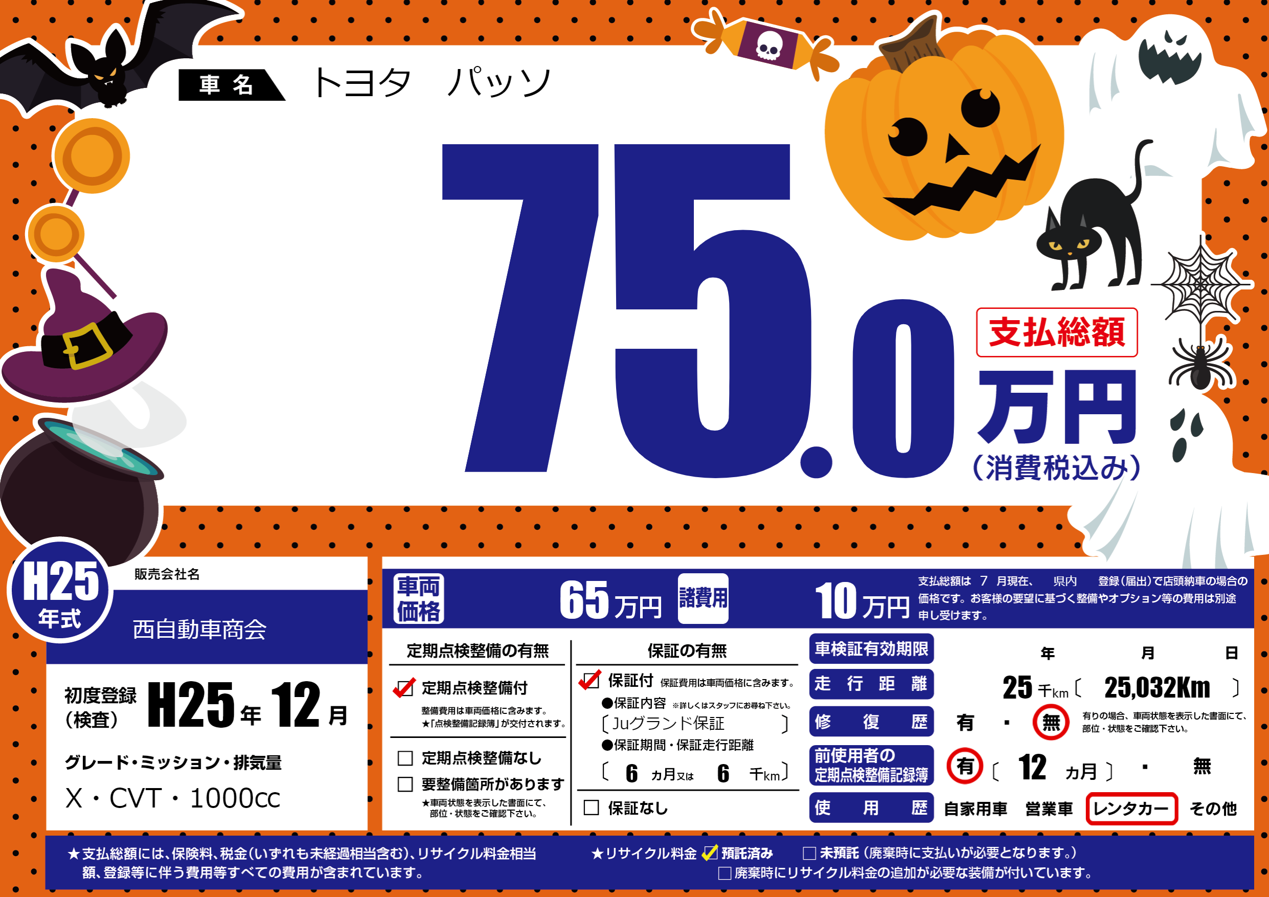 | 車名 | トヨタ パッソ | グレード ミッション 排気量 |
