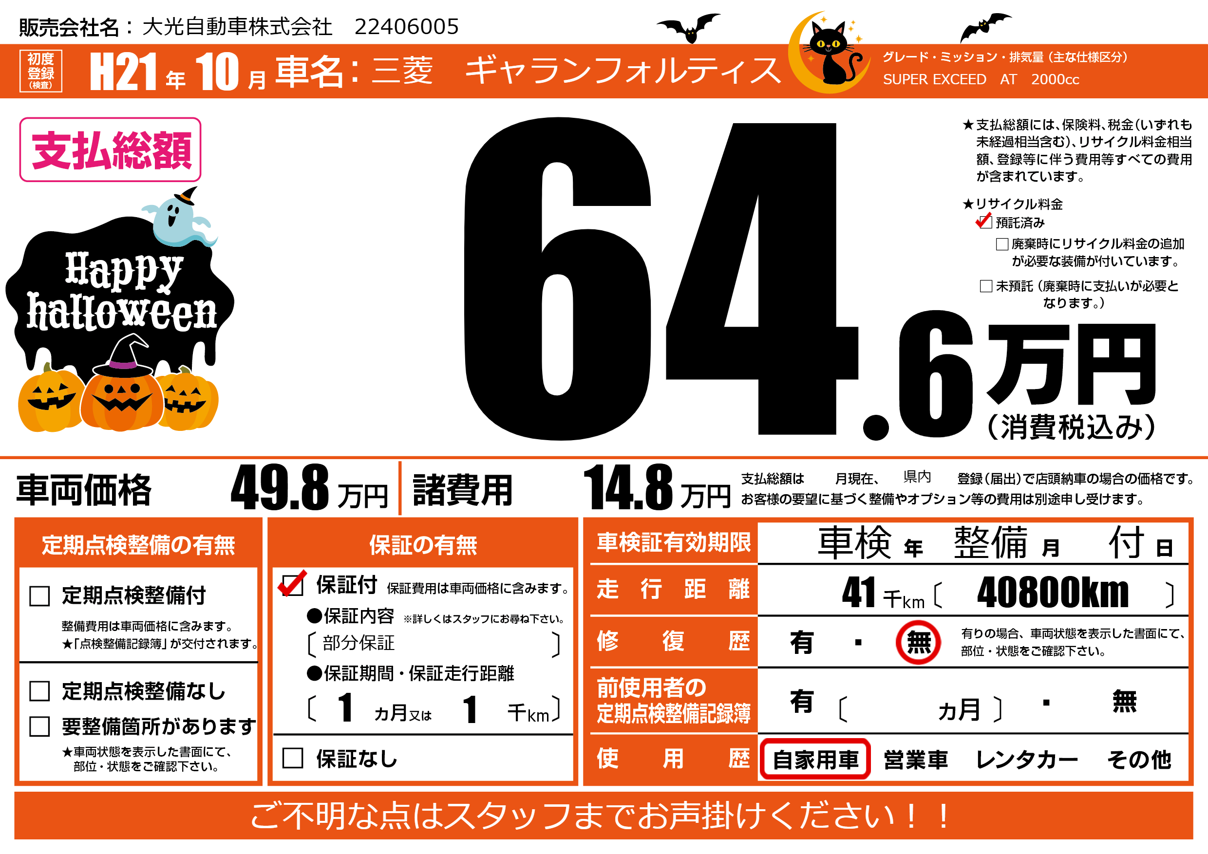 | 走行キロ | 4.1万km | 初年度登録 | H21年10月 |