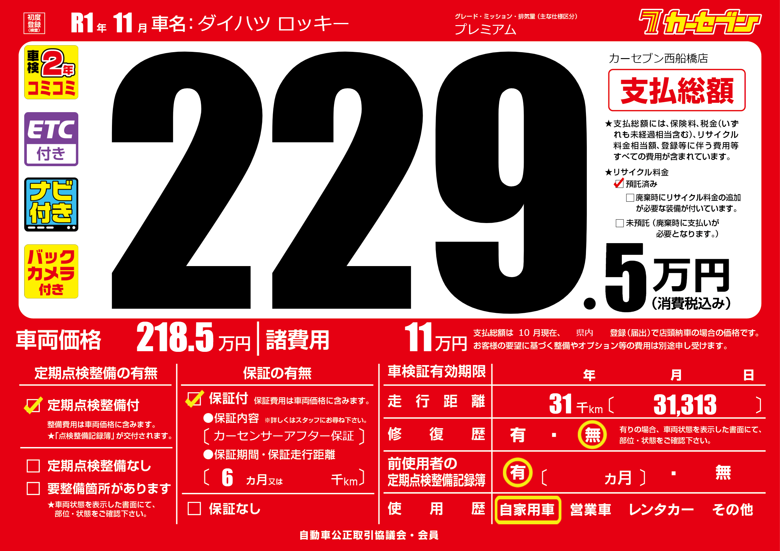 | 走行キロ | 3.1万km | 初年度登録 | R1年11月 |