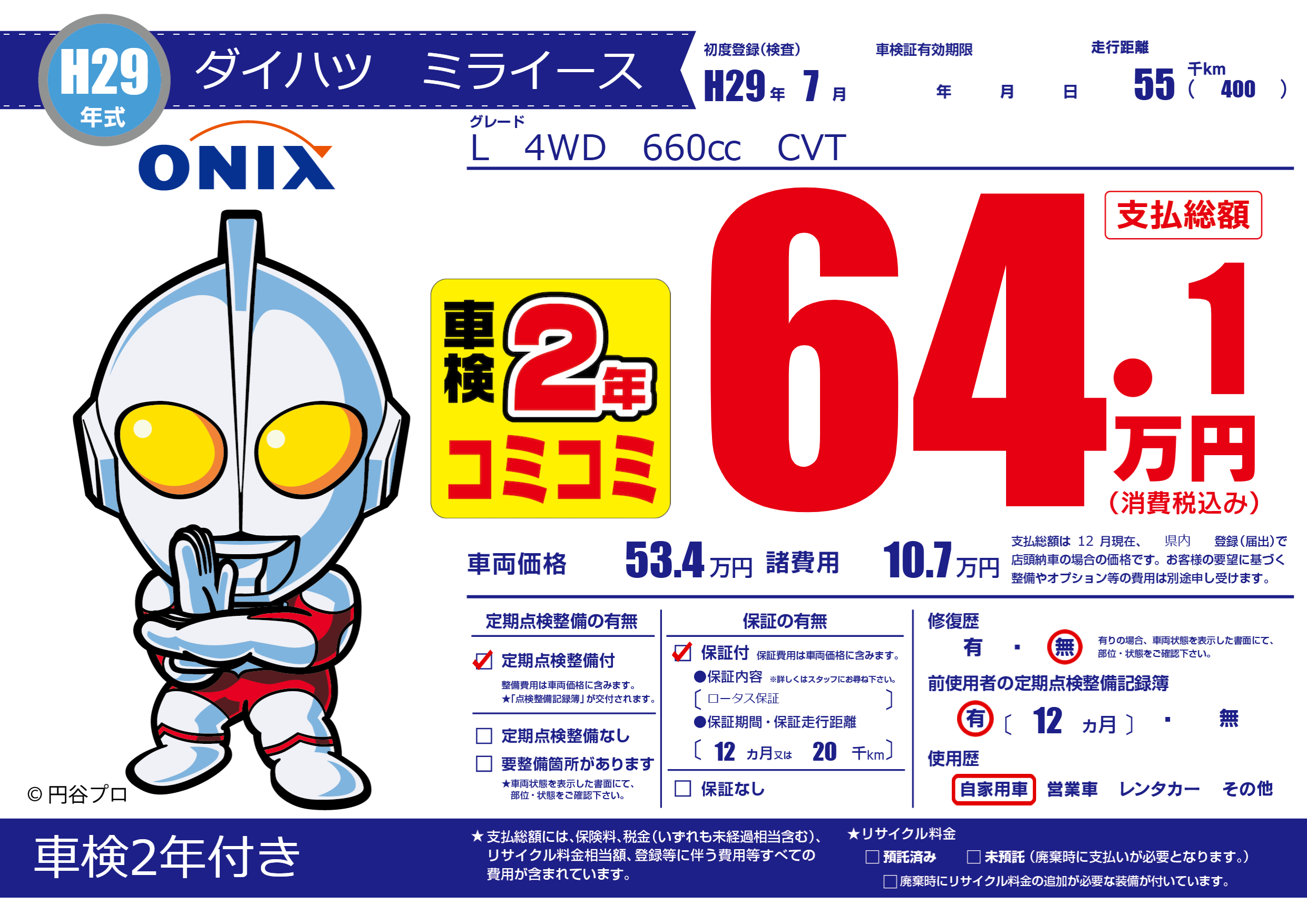 | 車名 | ダイハツ ミライース | グレード ミッション 排気量 |