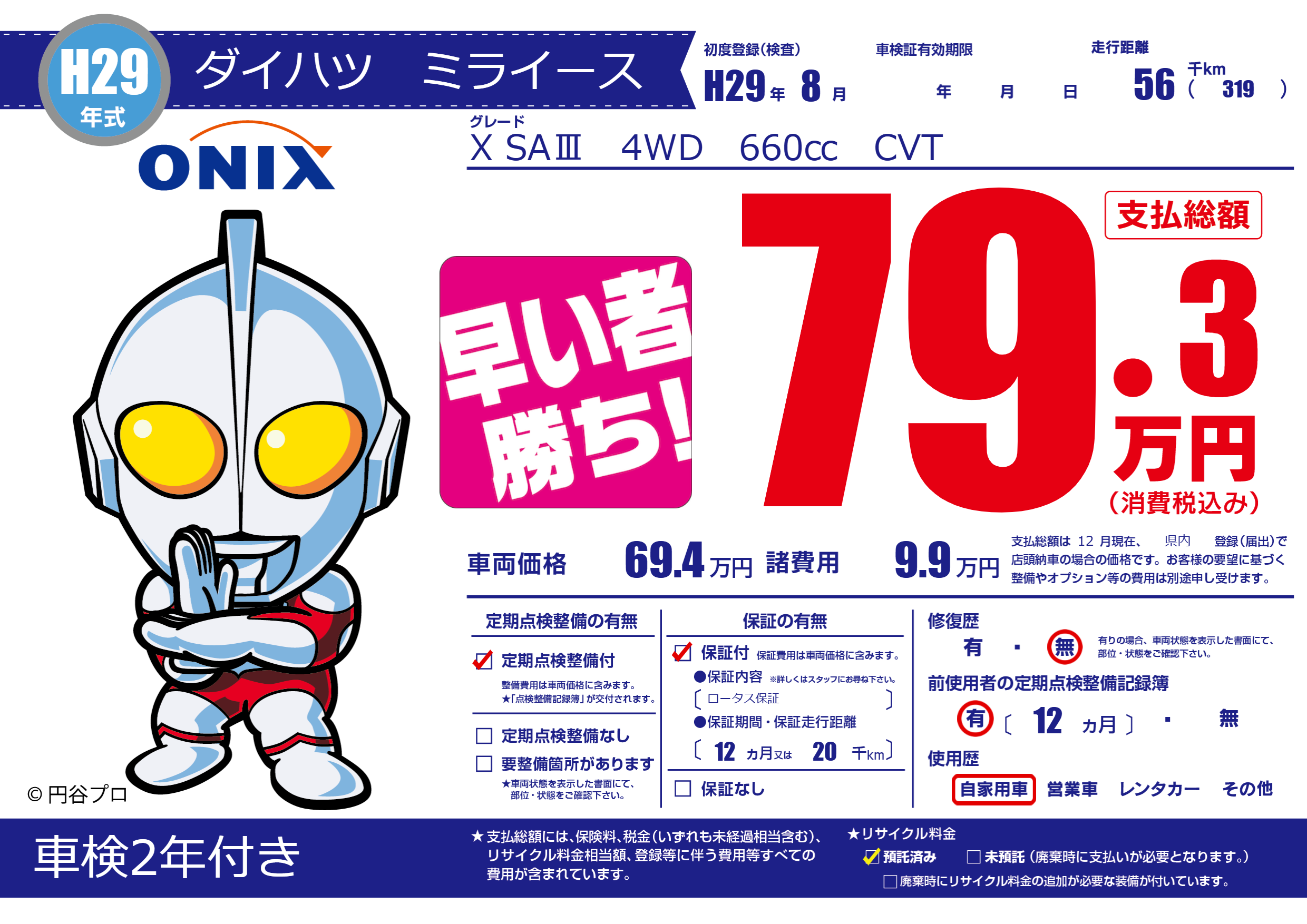 | 車名 | ダイハツ ミライース | グレード ミッション 排気量 |