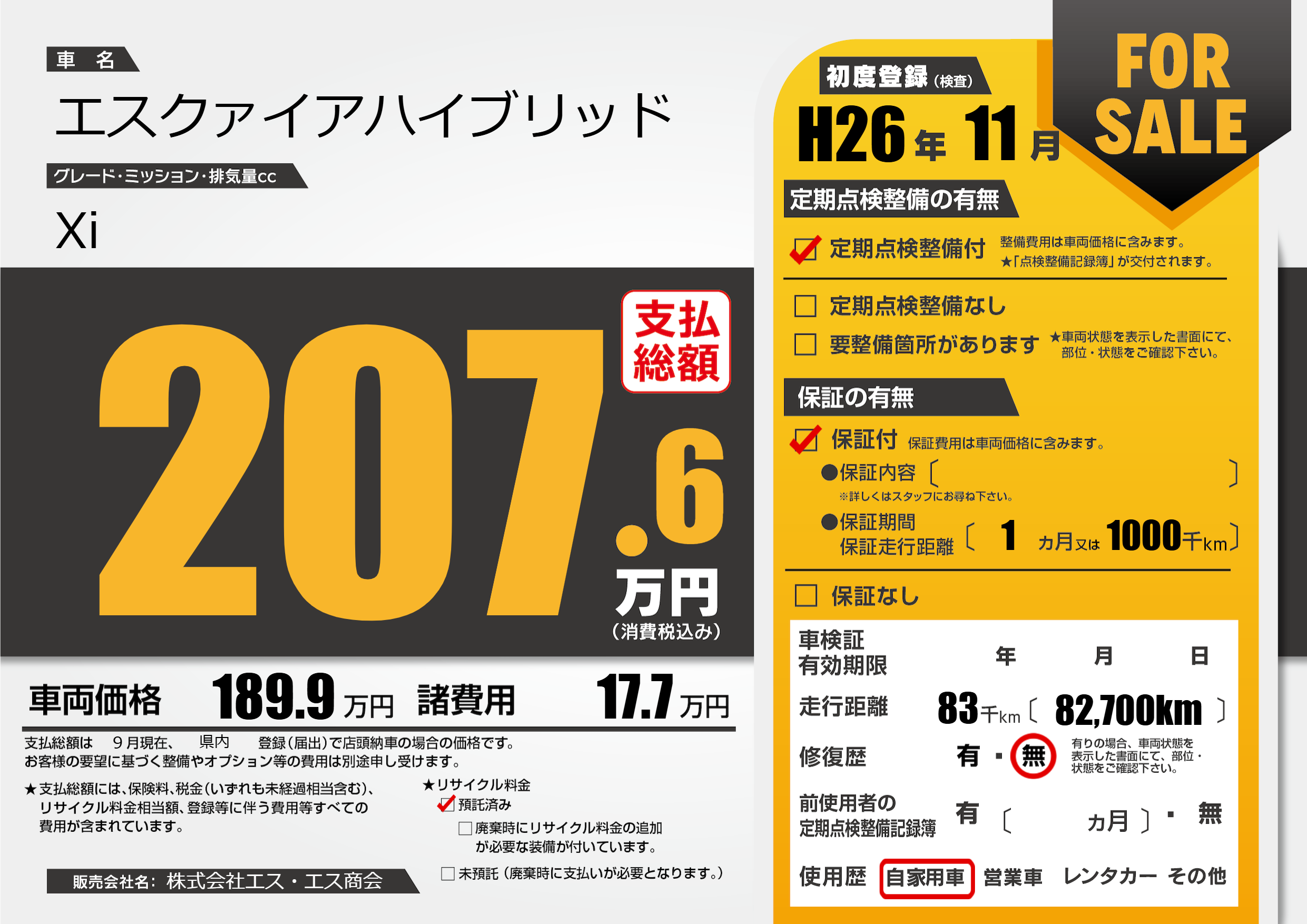 | 走行キロ | 8.3万km | 初年度登録 | H26年11月 |