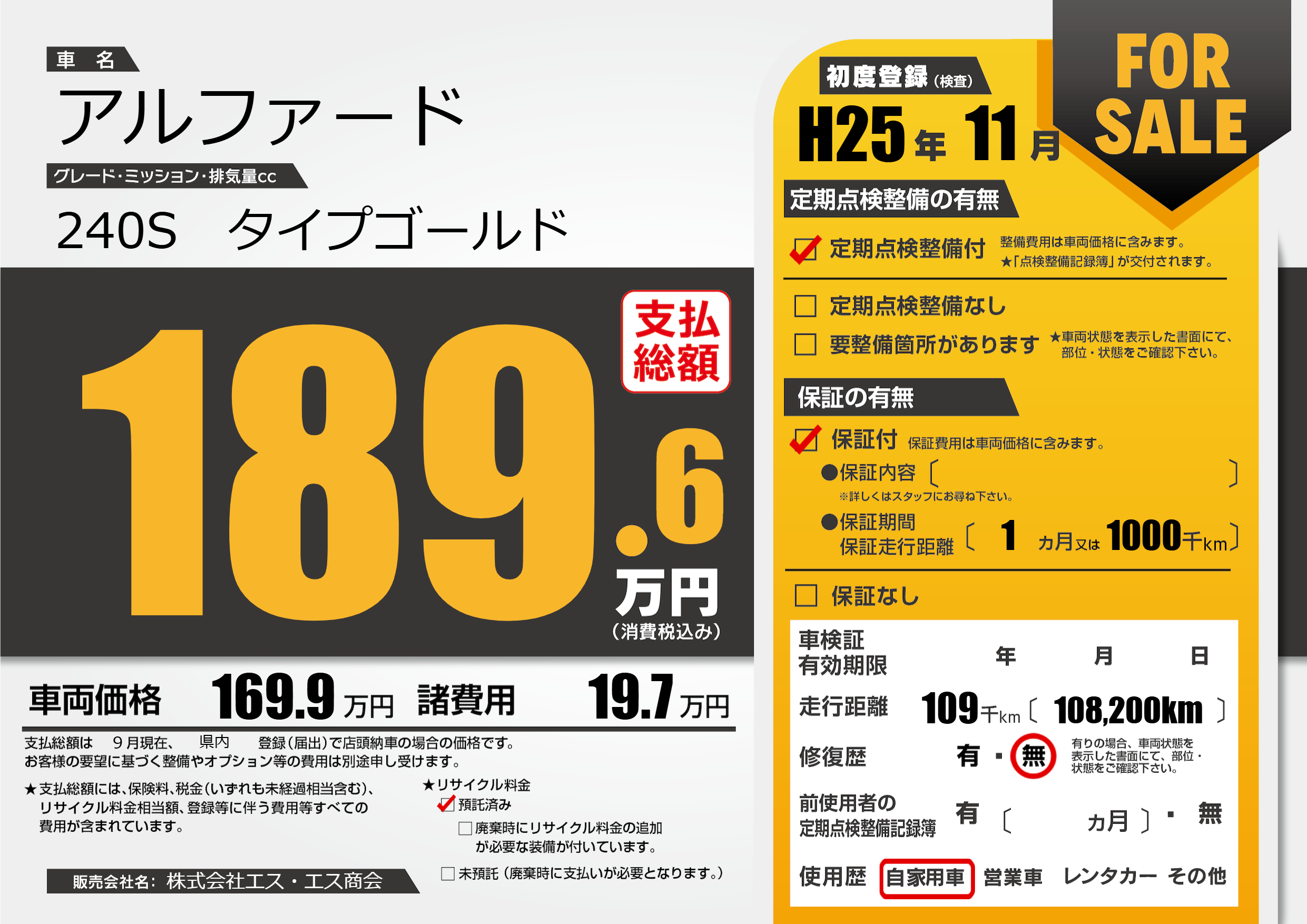 | 走行キロ | 10.9万km | 初年度登録 | H25年11月 |