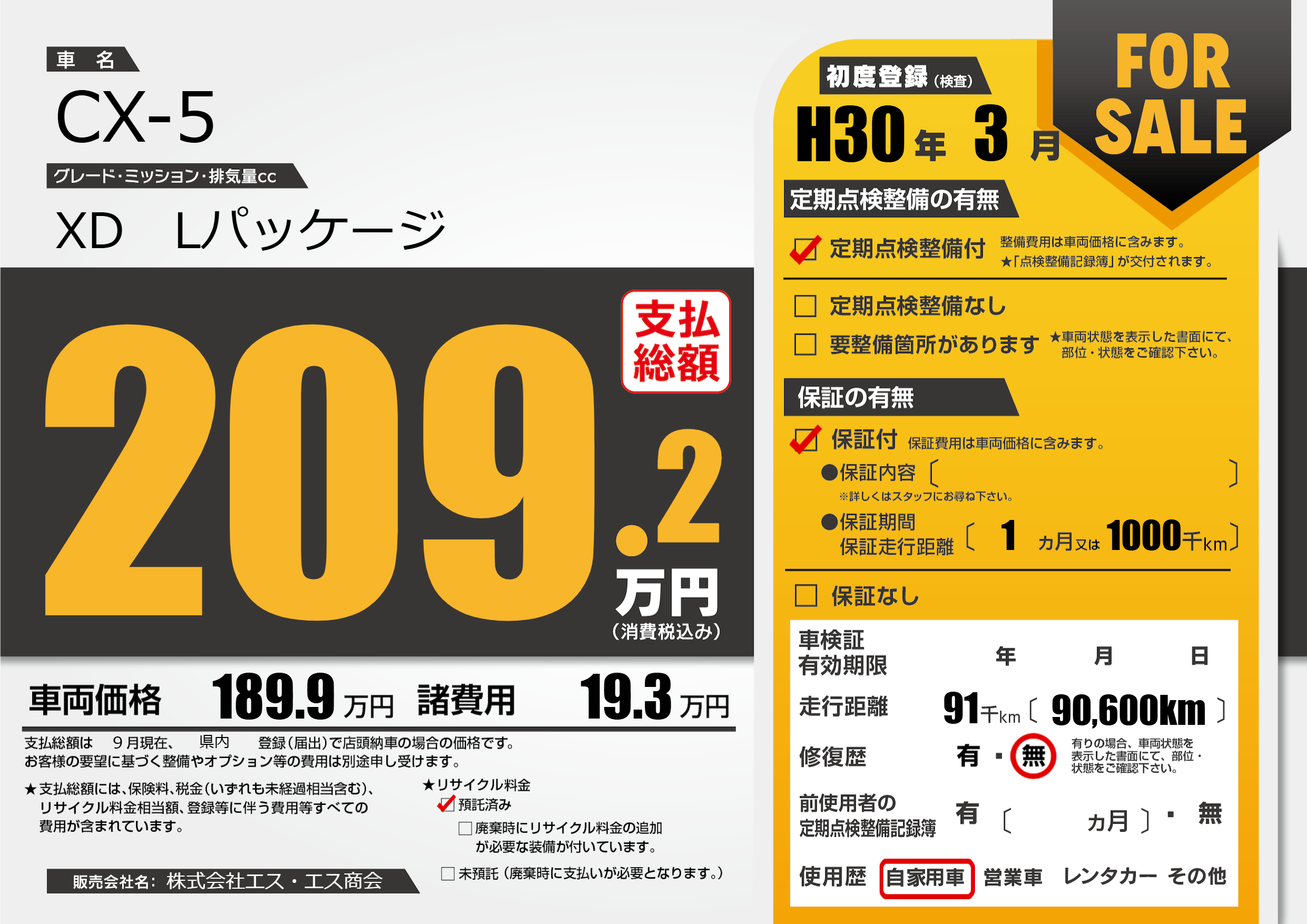 | 走行キロ | 9.1万km | 初年度登録 | H30年3月 |
