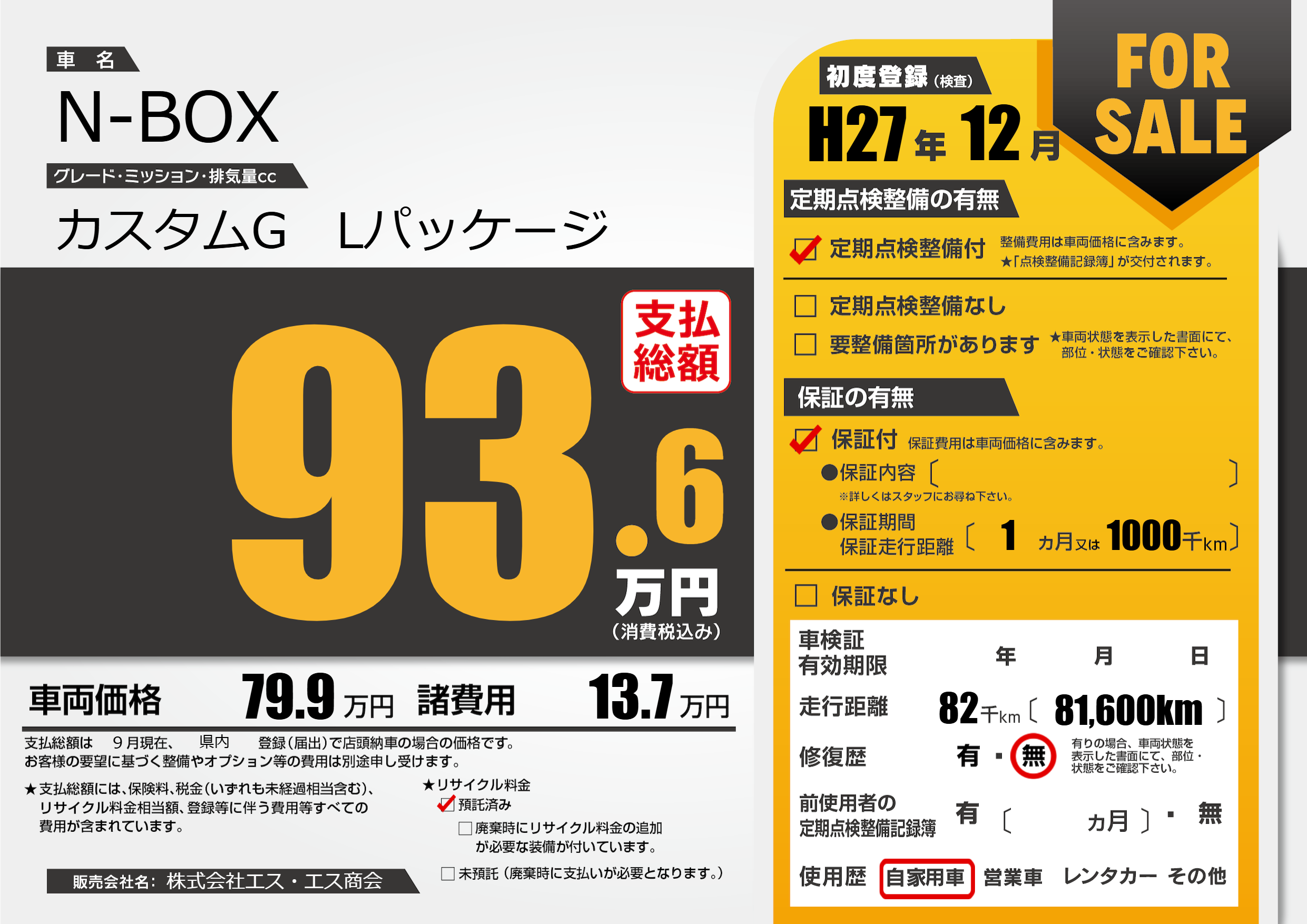 | 車名 | N-BOX | グレード ミッション 排気量 |