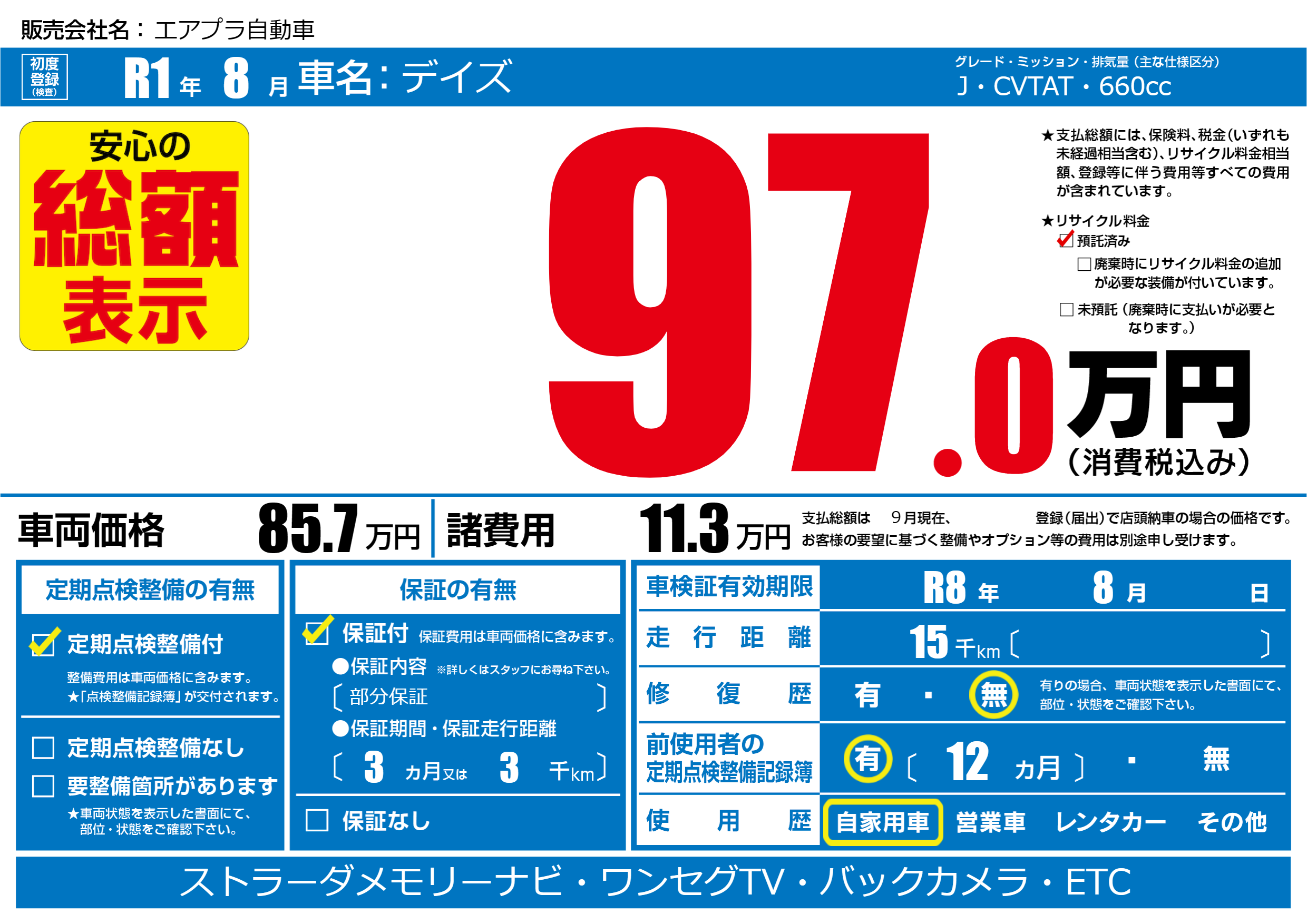 | 車名 | デイズ | グレード ミッション 排気量 |