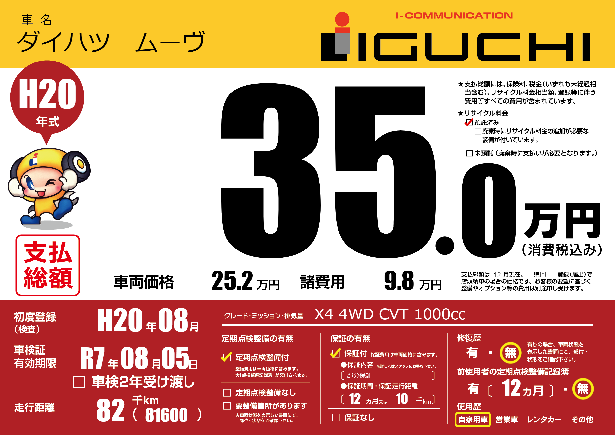 | 走行キロ | 8.2万km | 初年度登録 | H20年08月 |