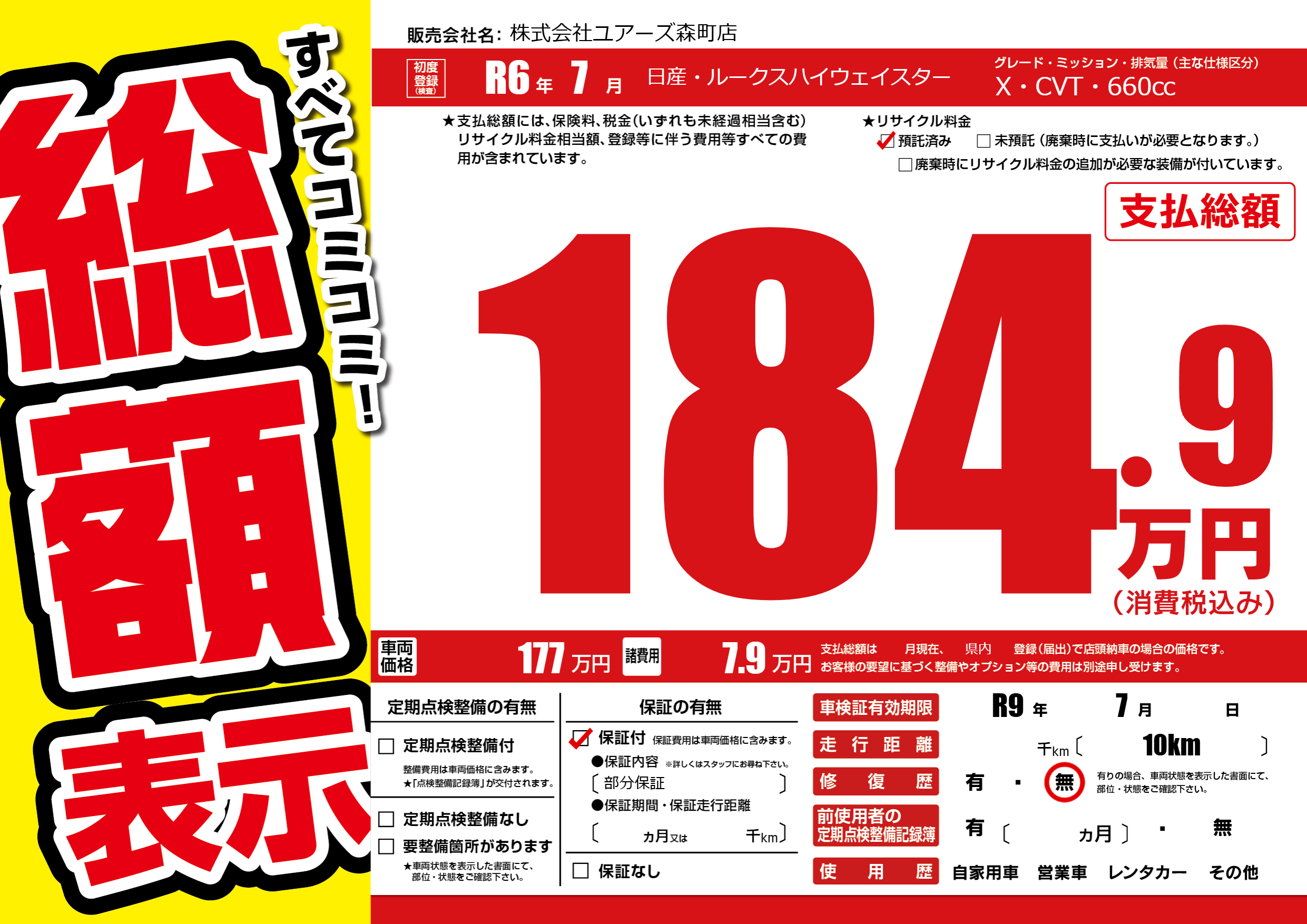 | 車名 | 日産・ルークスハイウェイスター | グレード ミッション 排気量 |