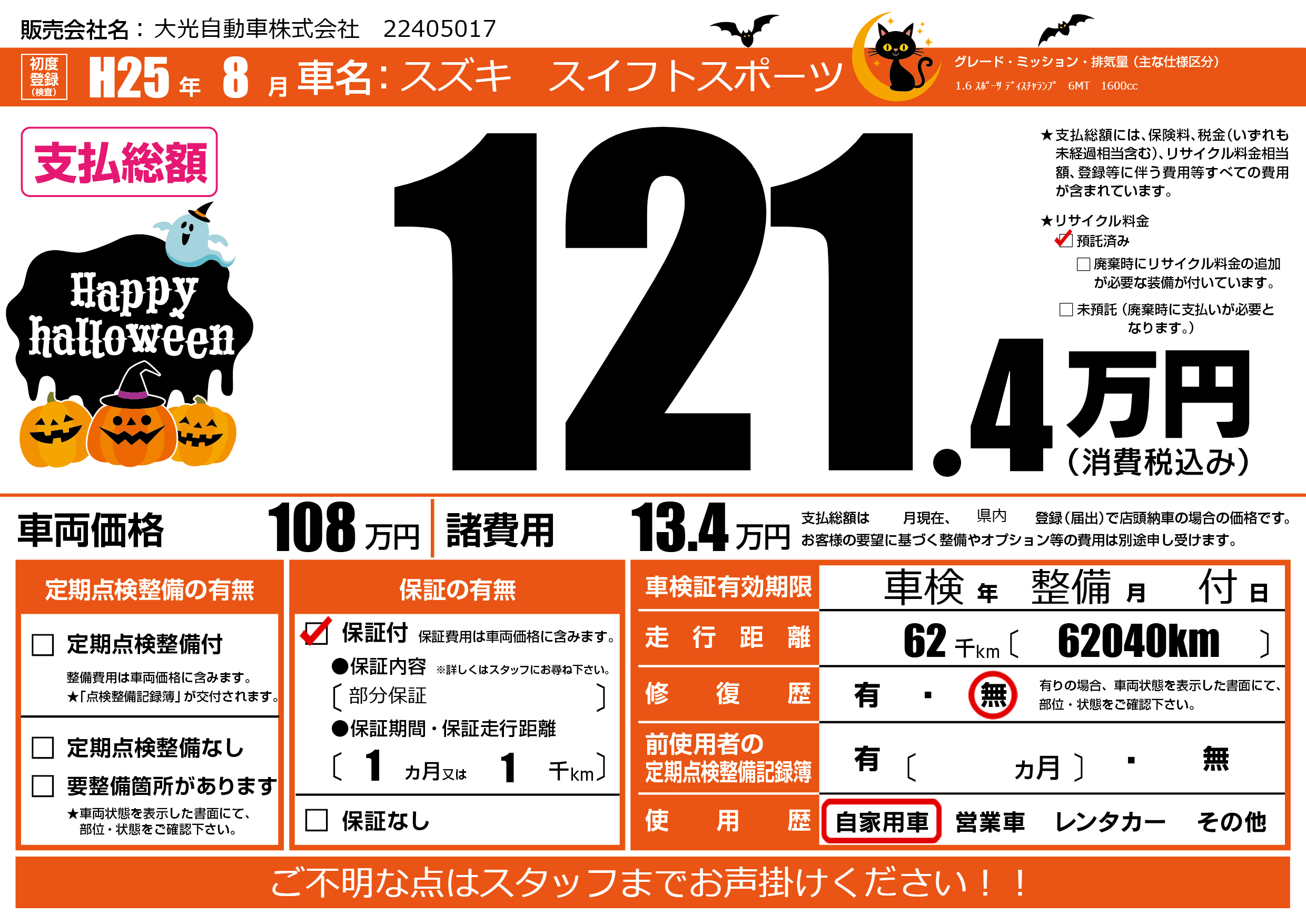 | 走行キロ | 6.2万km | 初年度登録 | H25年8月 |