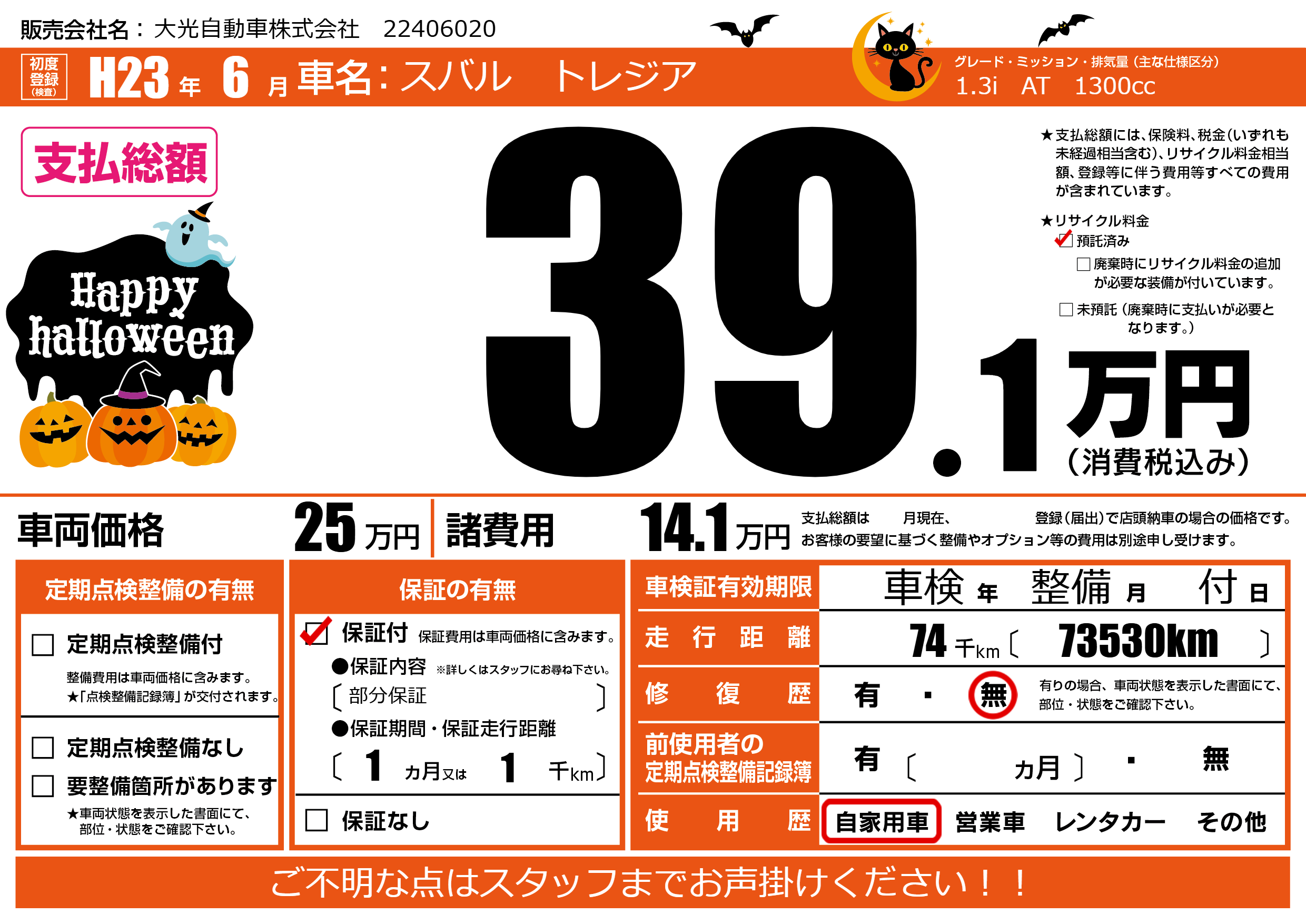 | 走行キロ | 7.4万km | 初年度登録 | H23年6月 |
