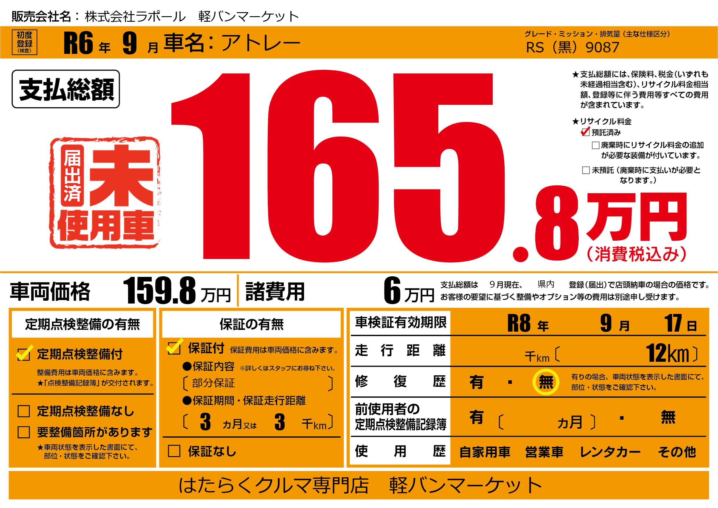 | 走行キロ | - | 初年度登録 | R6年9月 |