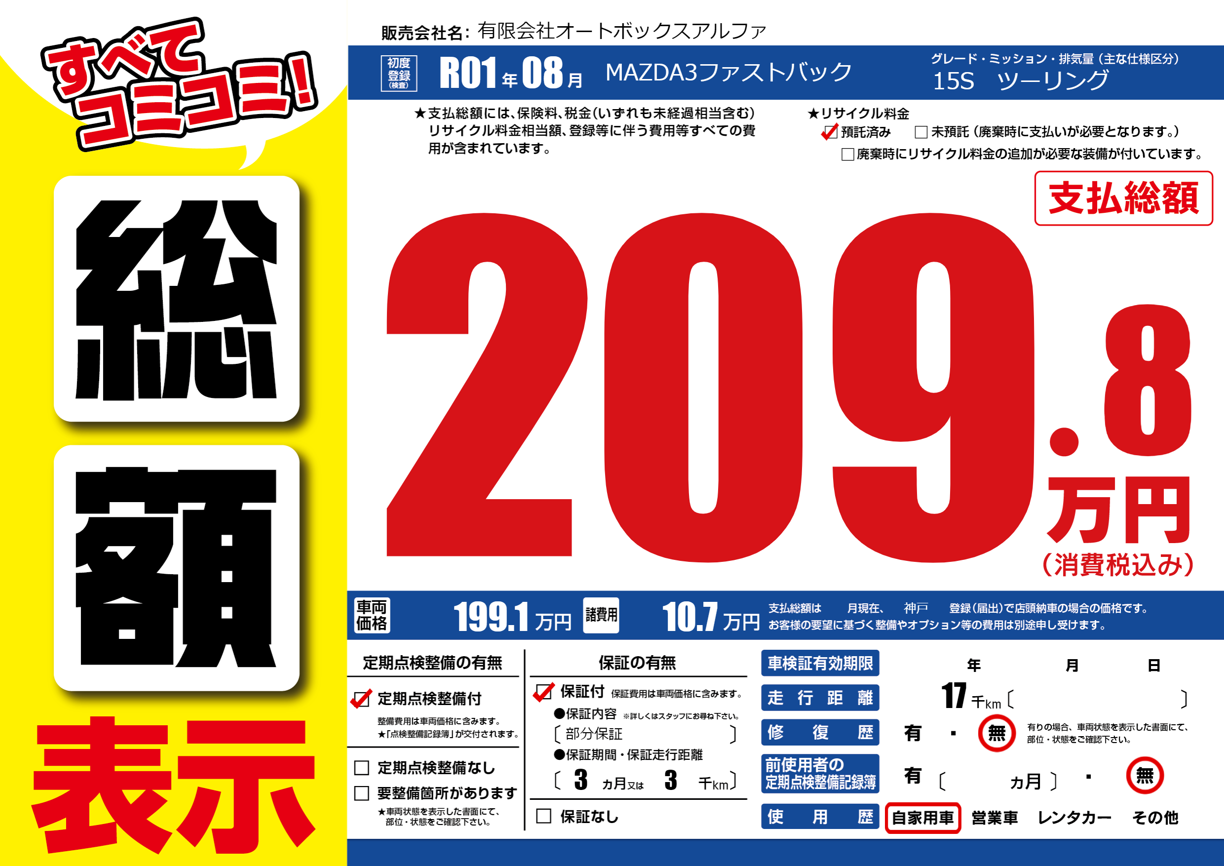 | 車名 | MAZDA3ファストバック | グレード ミッション 排気量 |