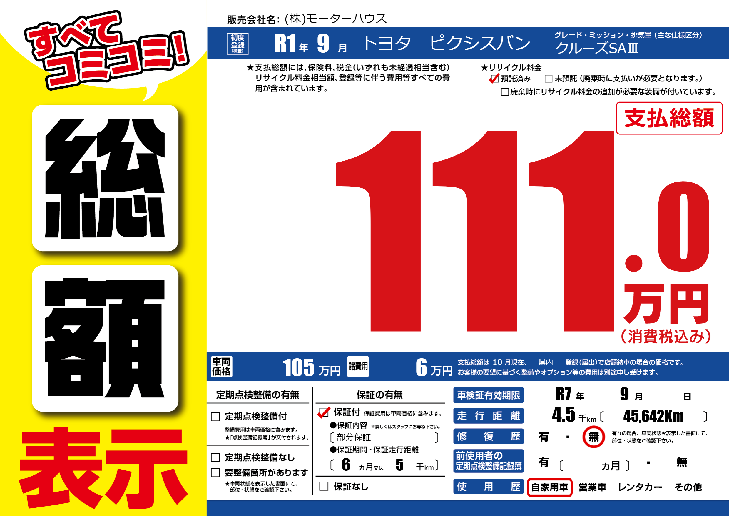 | 車名 | トヨタ ピクシスバン | グレード ミッション 排気量 |