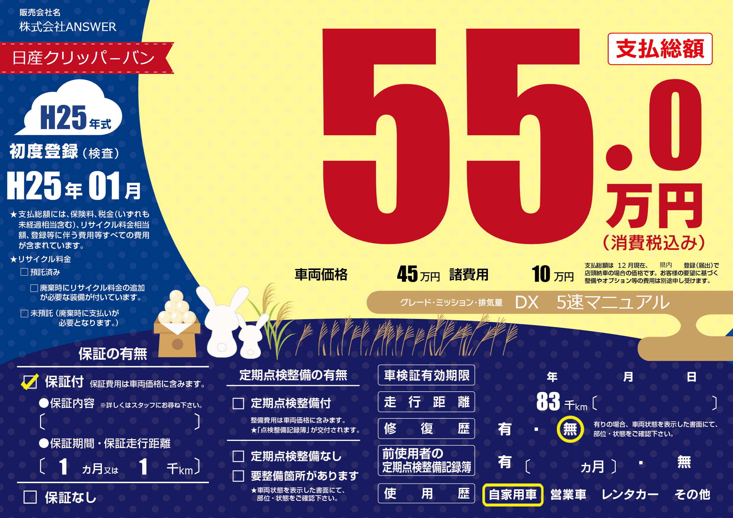| 車名 | 日産クリッパ-バン | グレード ミッション 排気量 |