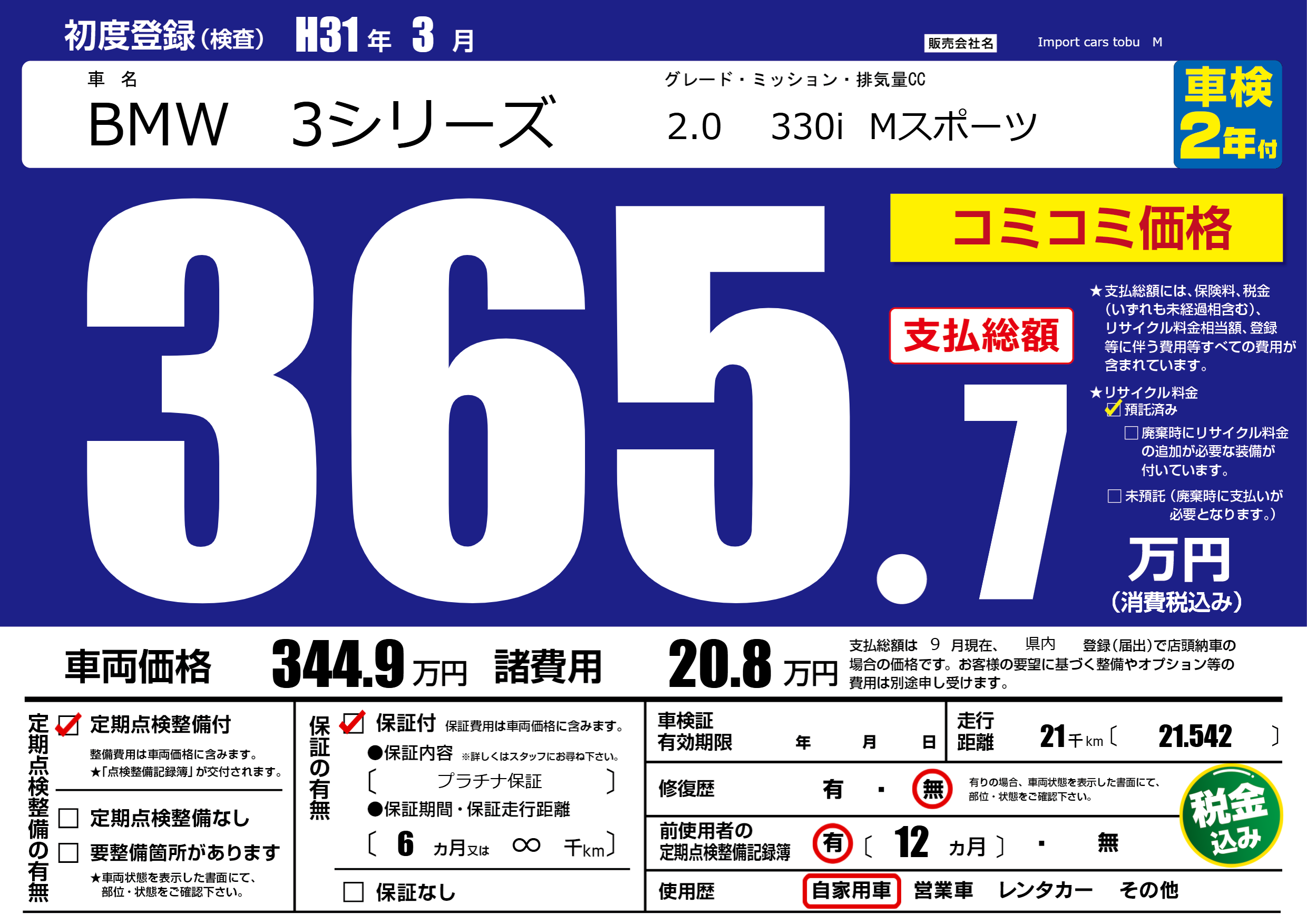 | 車名 | BMW 3シリーズ | グレード ミッション 排気量 |