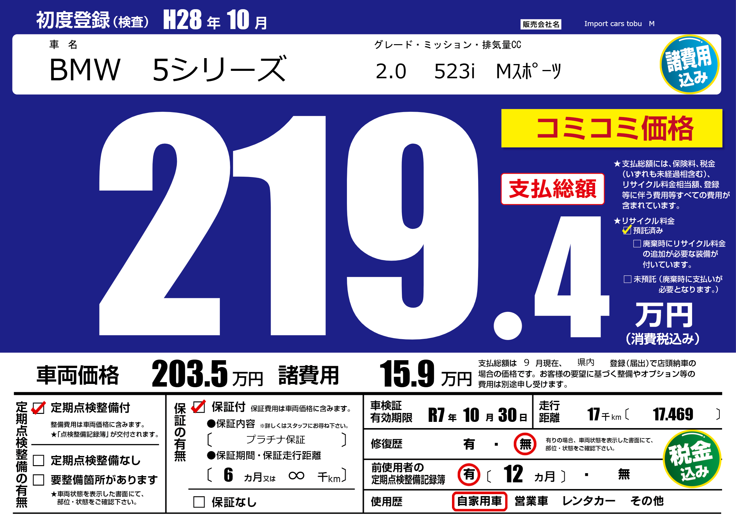 | 車名 | BMW 5シリーズ | グレード ミッション 排気量 |
