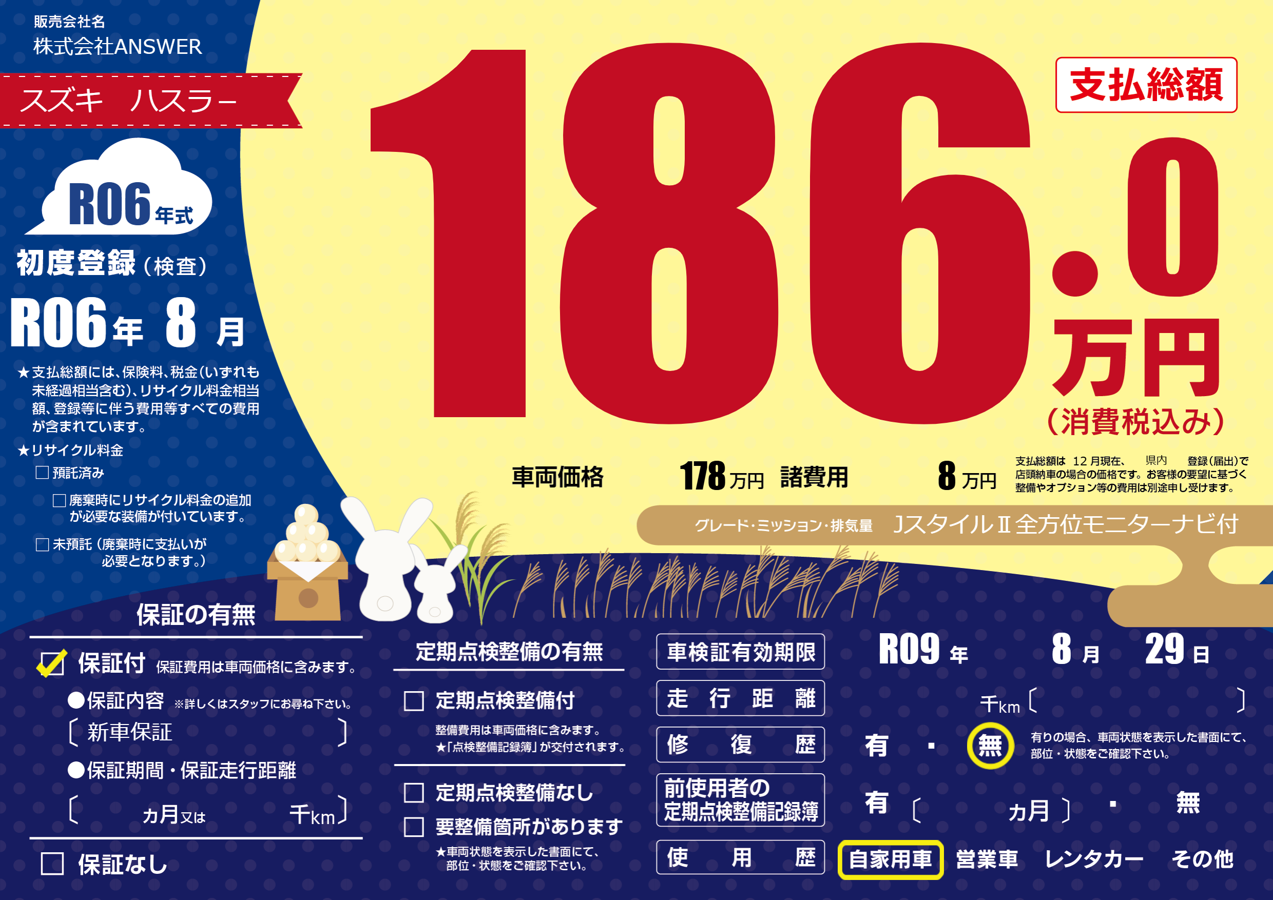 | 走行キロ | - | 初年度登録 | R06年8月 |
