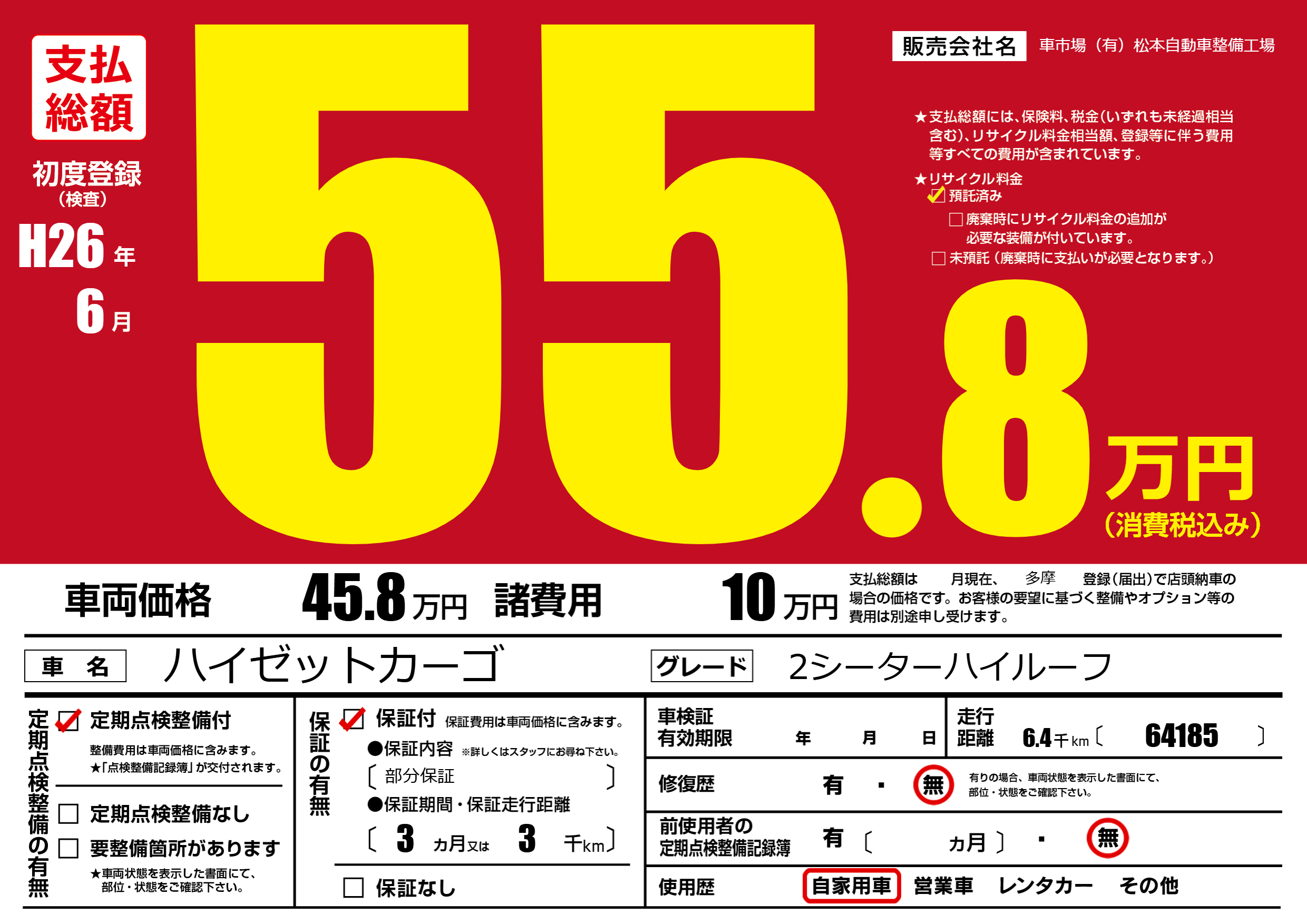| 車名 | ハイゼットカーゴ | グレード ミッション 排気量 |