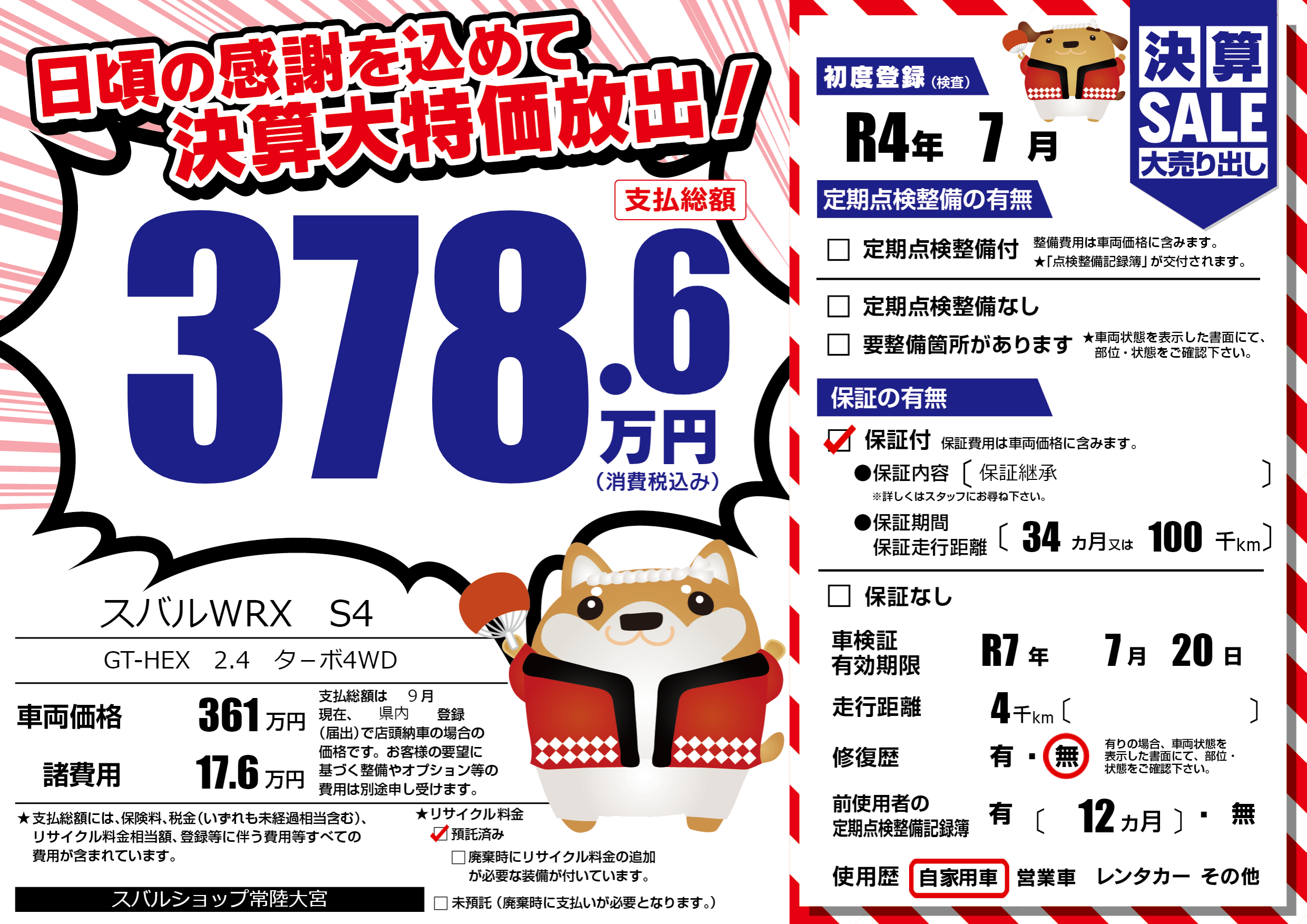 | 車名 | スバルWRX S4 | グレード ミッション 排気量 |