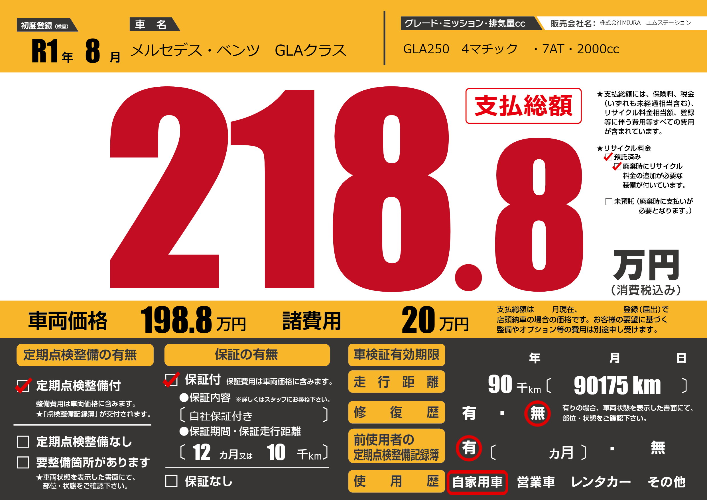 | 車名 | メルセデス・ベンツ GLAクラス | グレード ミッション 排気量 |