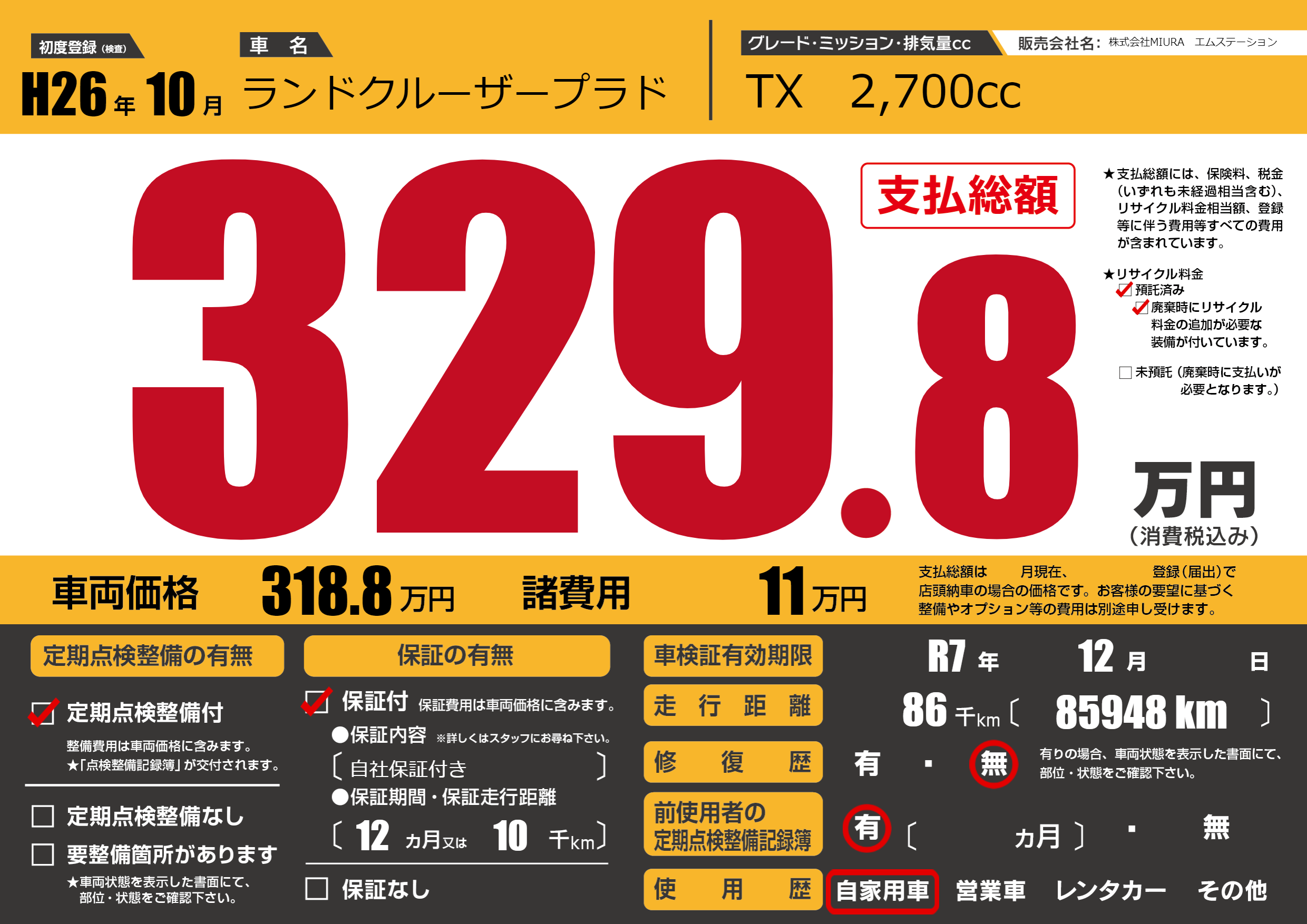 | 車名 | ランドクルーザープラド | グレード ミッション 排気量 |