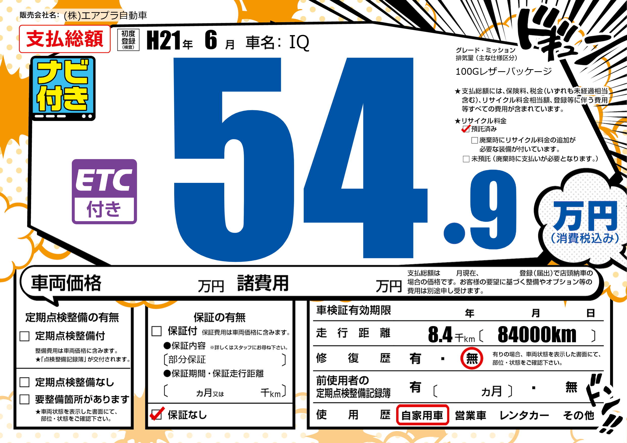 | 走行キロ | 0.8万km | 初年度登録 | H21年6月 |