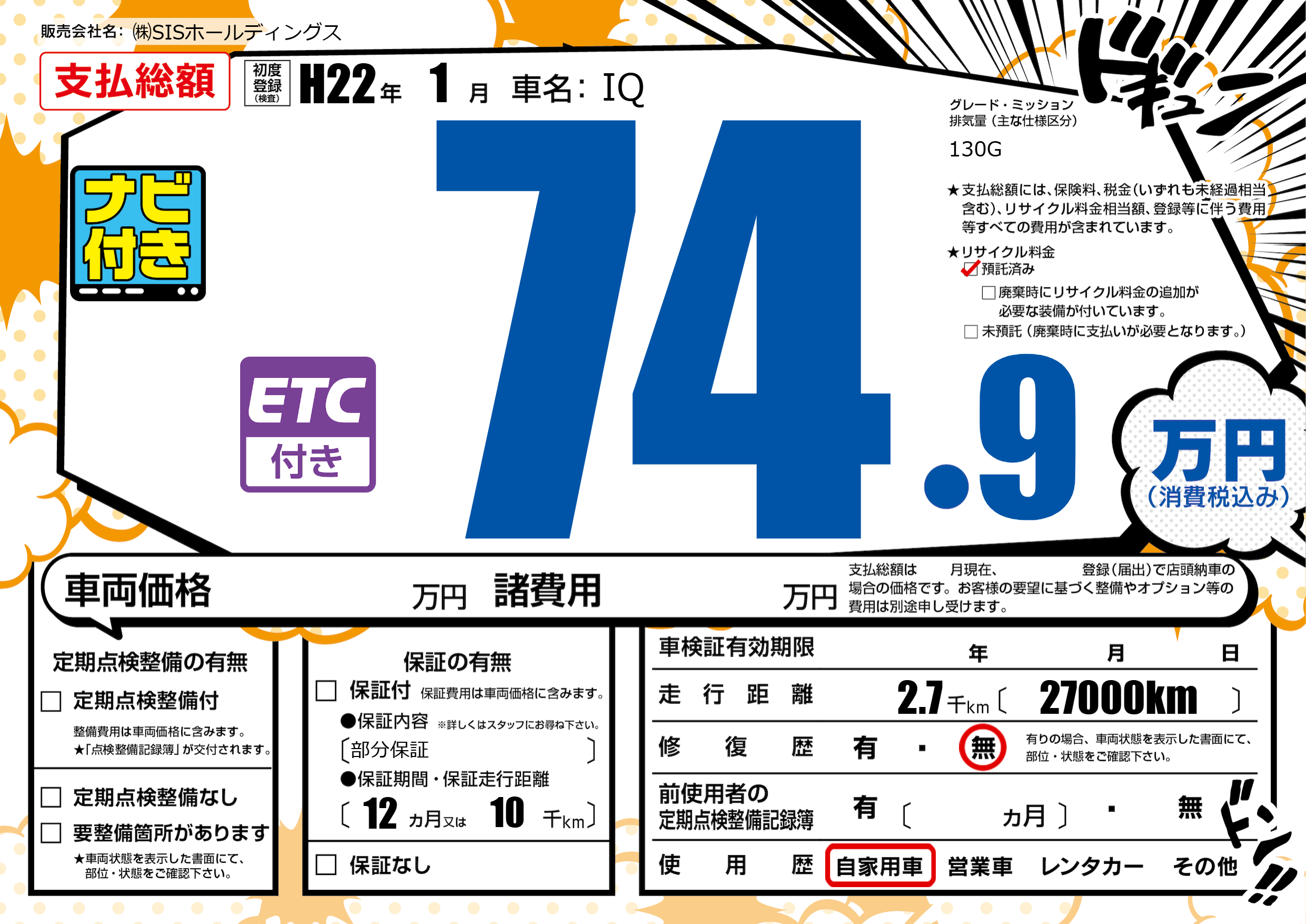 | 走行キロ | 0.2万km | 初年度登録 | H22年1月 |