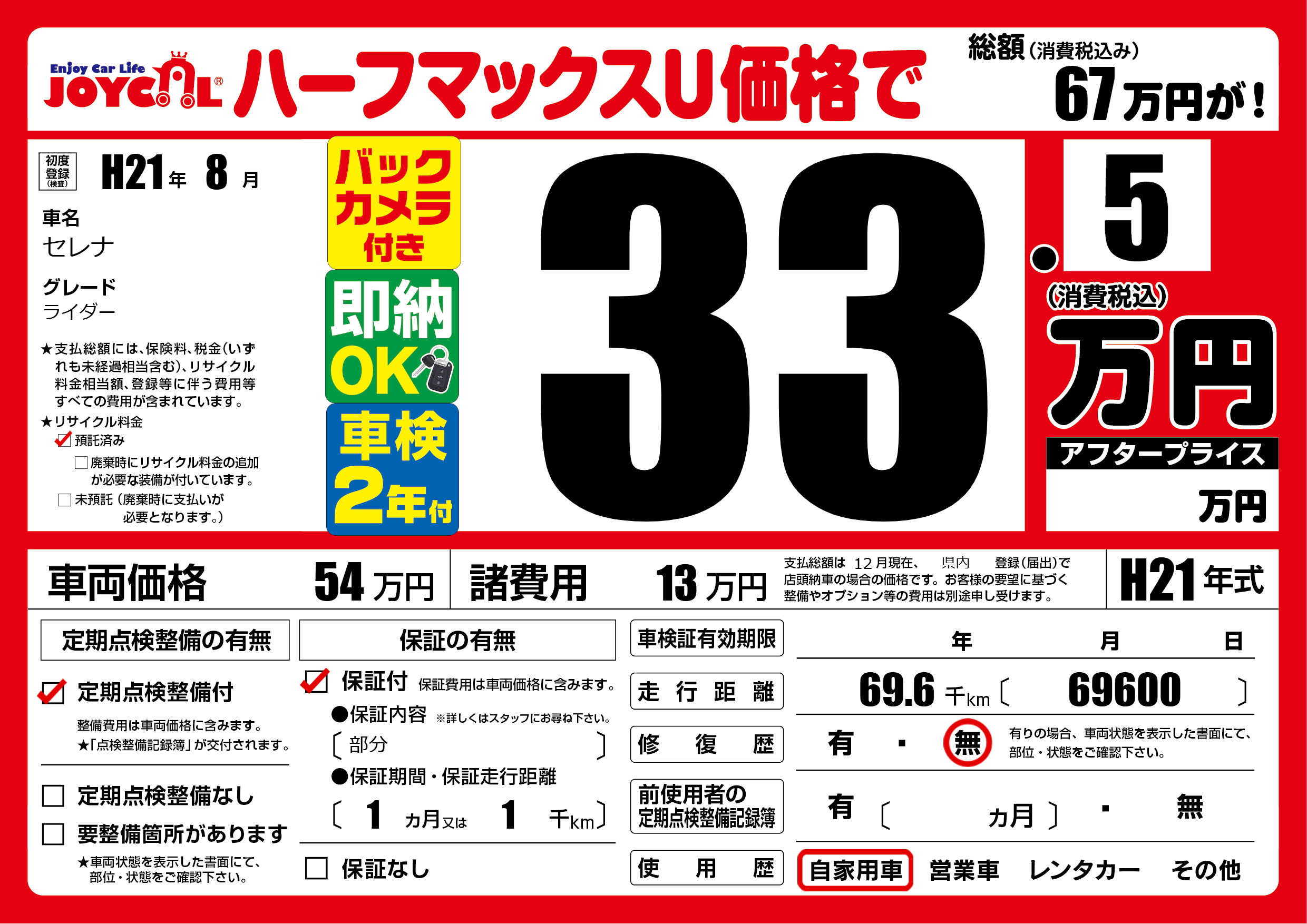 | 走行キロ | 6.9万km | 初年度登録 | H21年8月 |