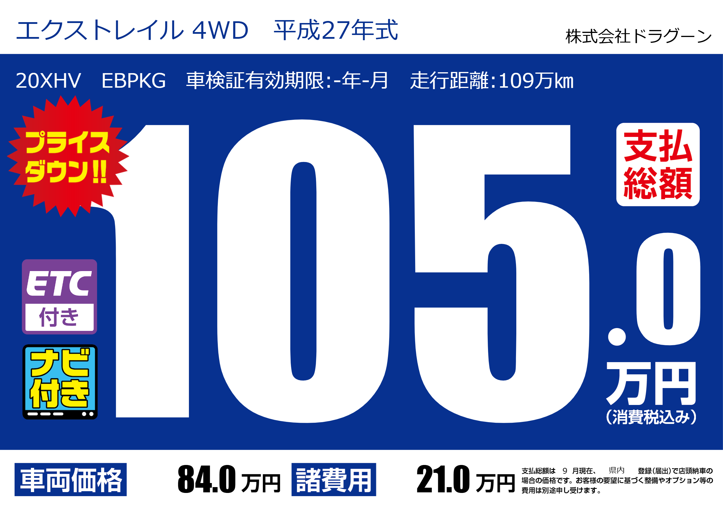 20XHV EBPKG 車検証有効期限:-年-月 走行距離:109万㎞ |