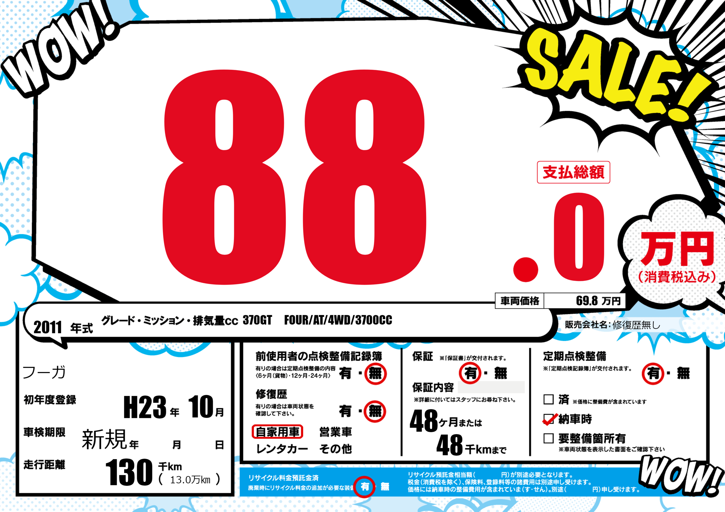 | 走行キロ | 13万km | 初年度登録 | H23年10月 |