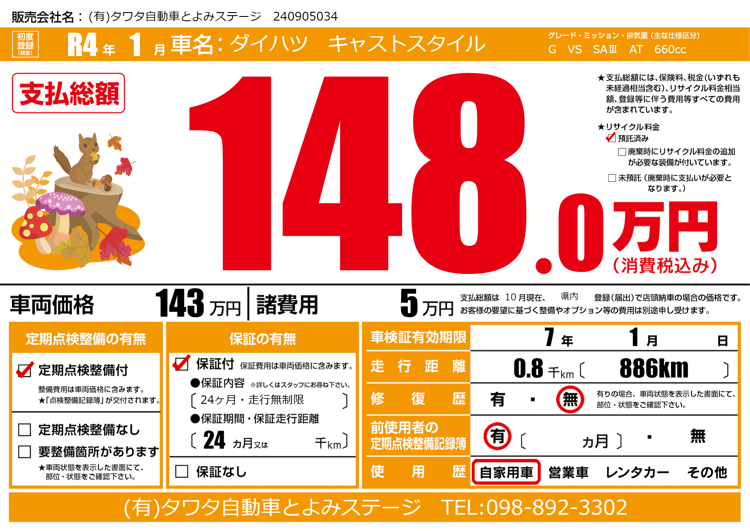 | 車名 | ダイハツ キャストスタイル | グレード ミッション 排気量 |