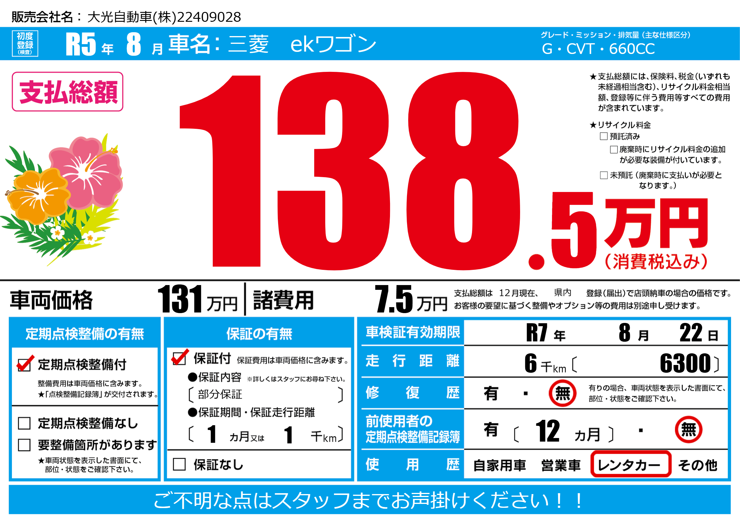 | 車検制限 | R7年 8月 22日 | ||