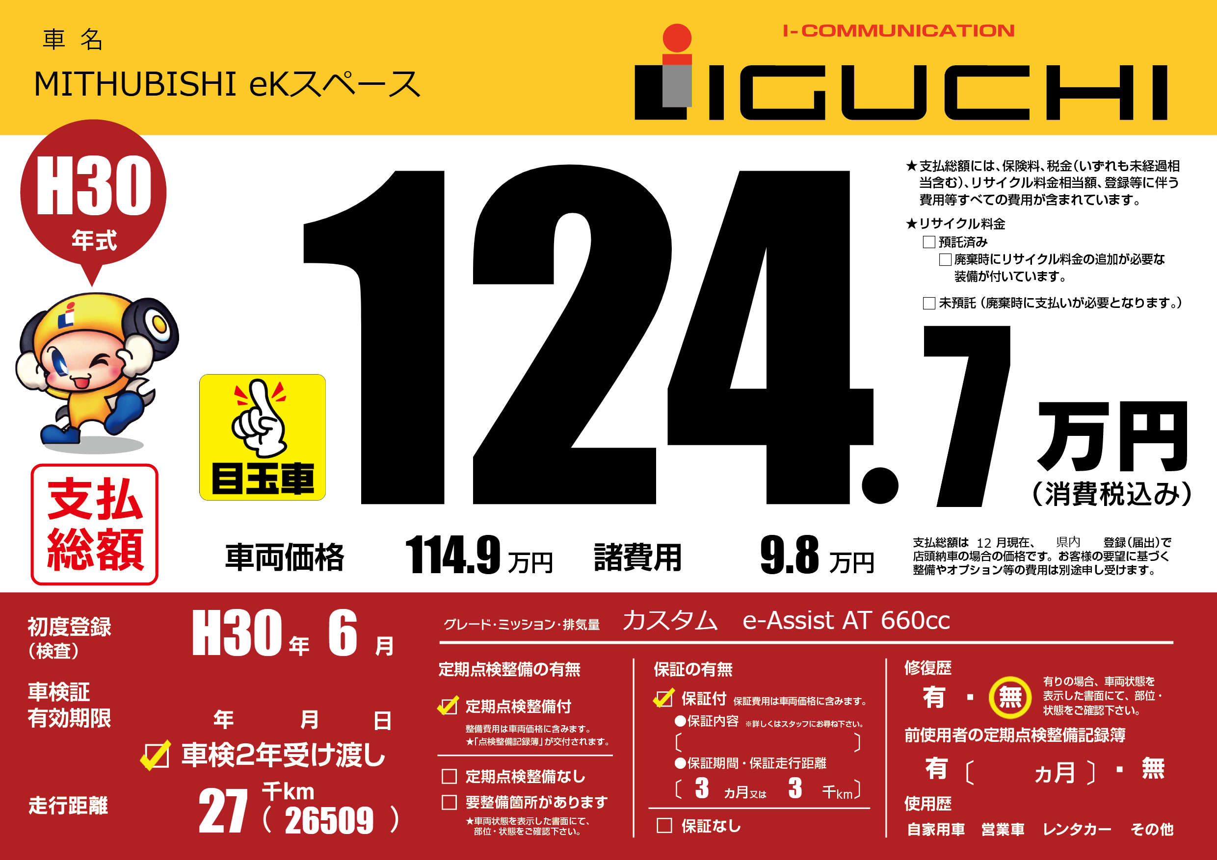 | 車名 | MITHUBISHI eKスペース | グレード ミッション 排気量 |