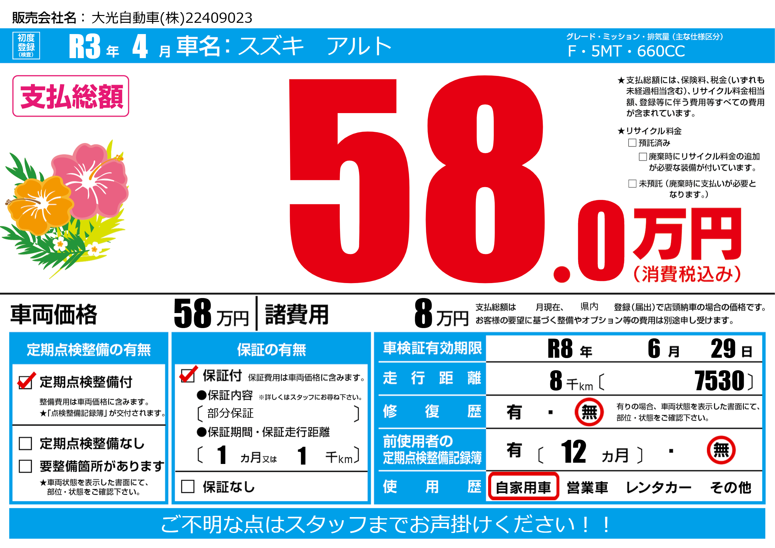 | 車名 | スズキ アルト | グレード ミッション 排気量 |