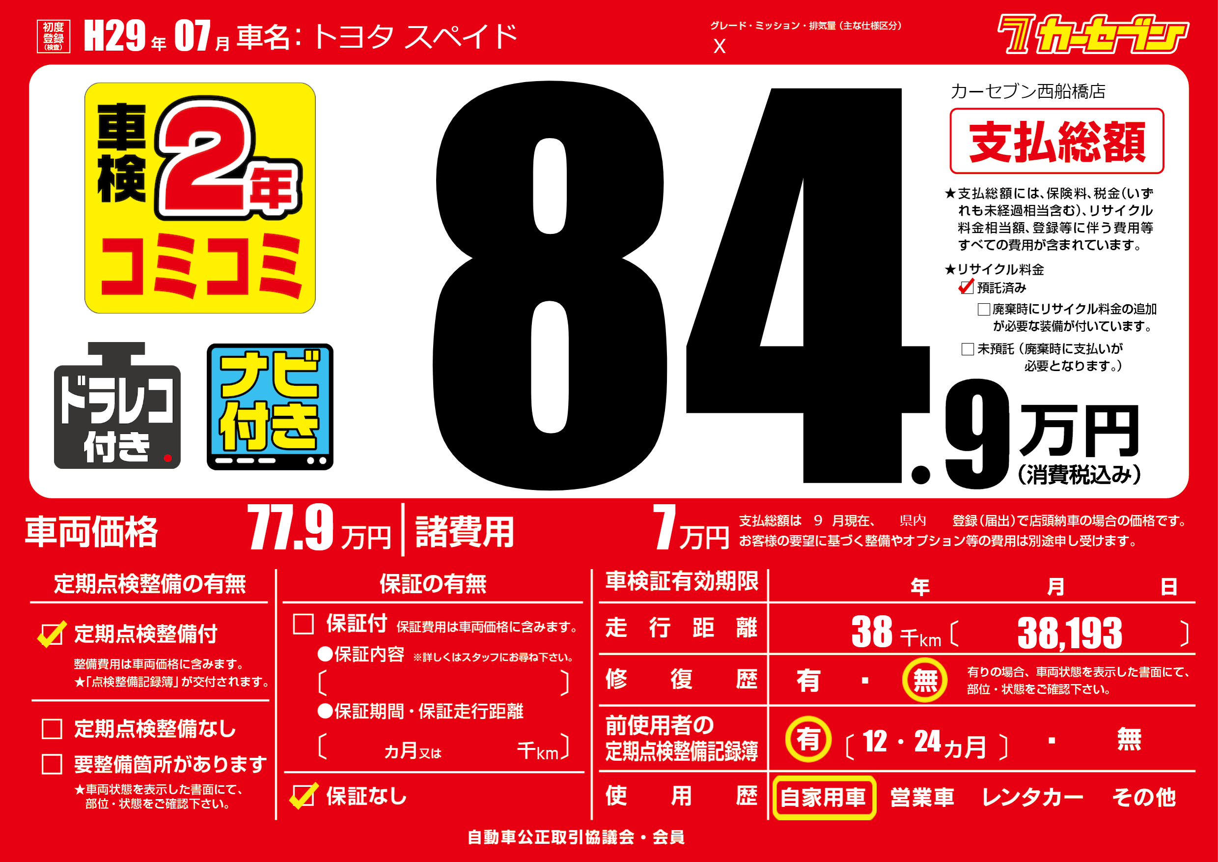 | 走行キロ | 3.8万km | 初年度登録 | H29年07月 |