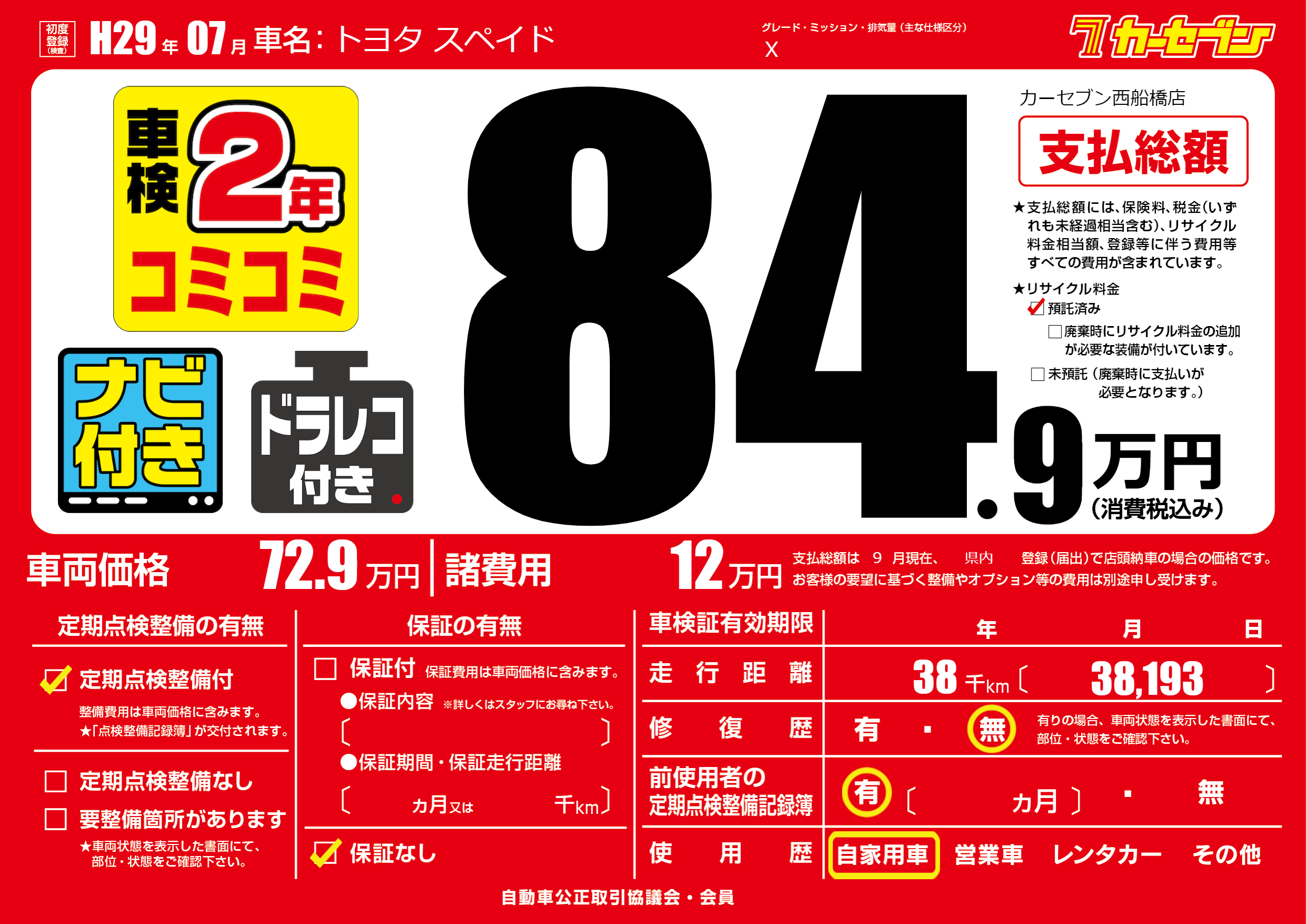 | 車名 | トヨタ スペイド | グレード ミッション 排気量 |