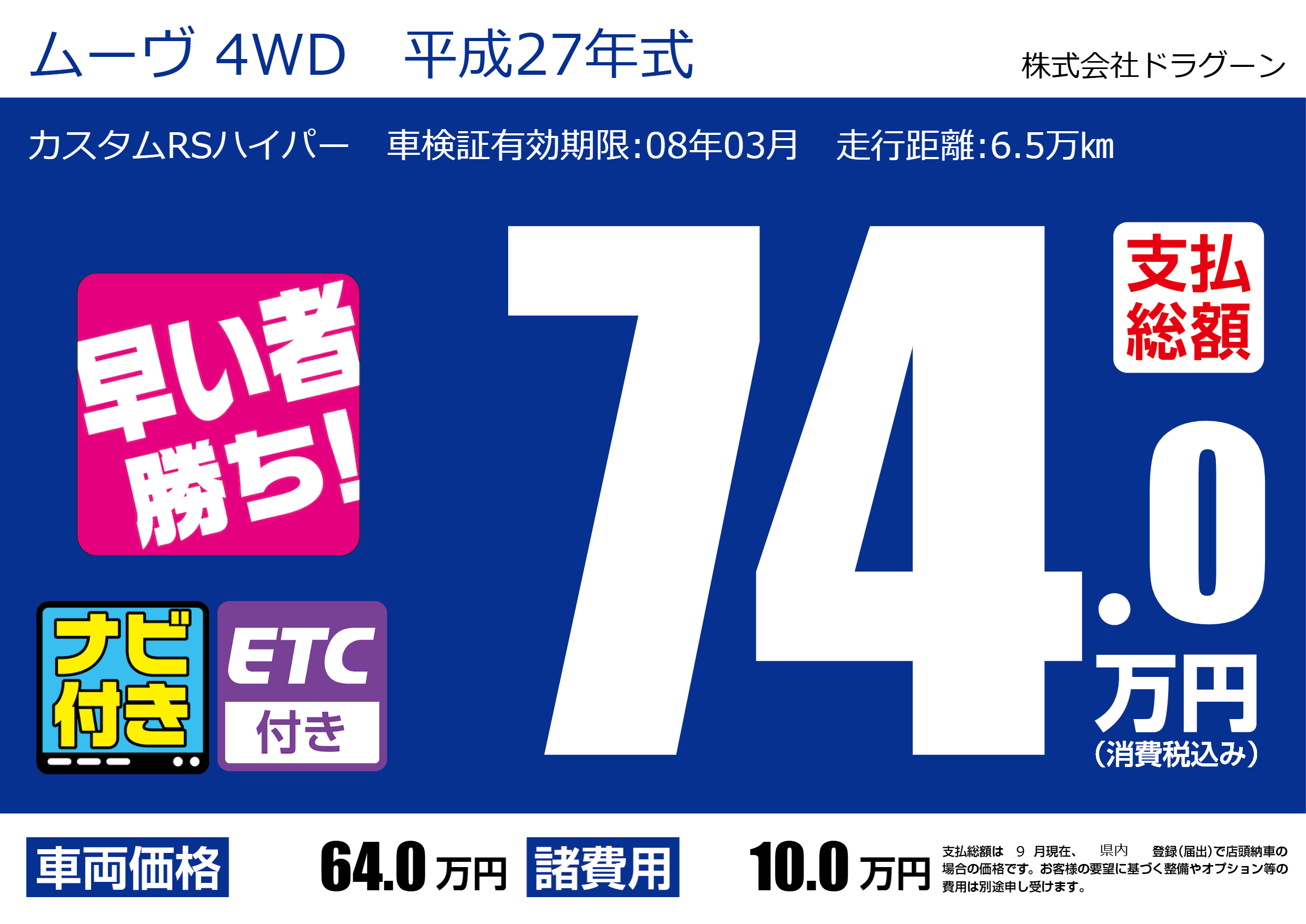 | 車名 | ムーヴ 4WD 平成27年式 | グレード ミッション 排気量 |