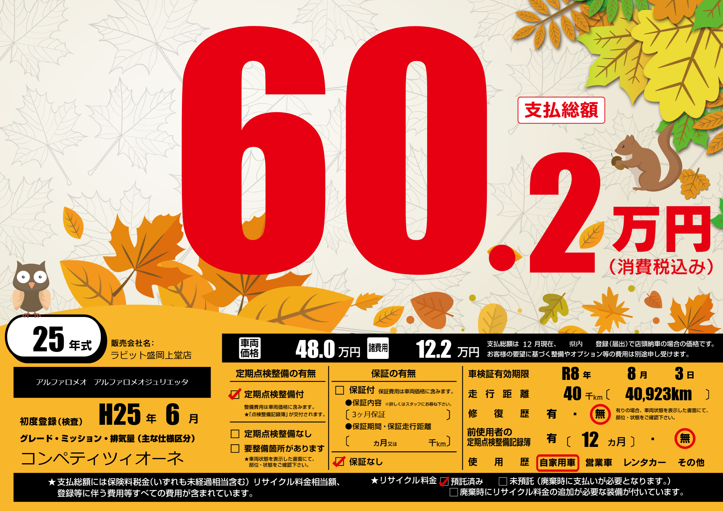 | 走行キロ | 4万km | 初年度登録 | H25年6月 |