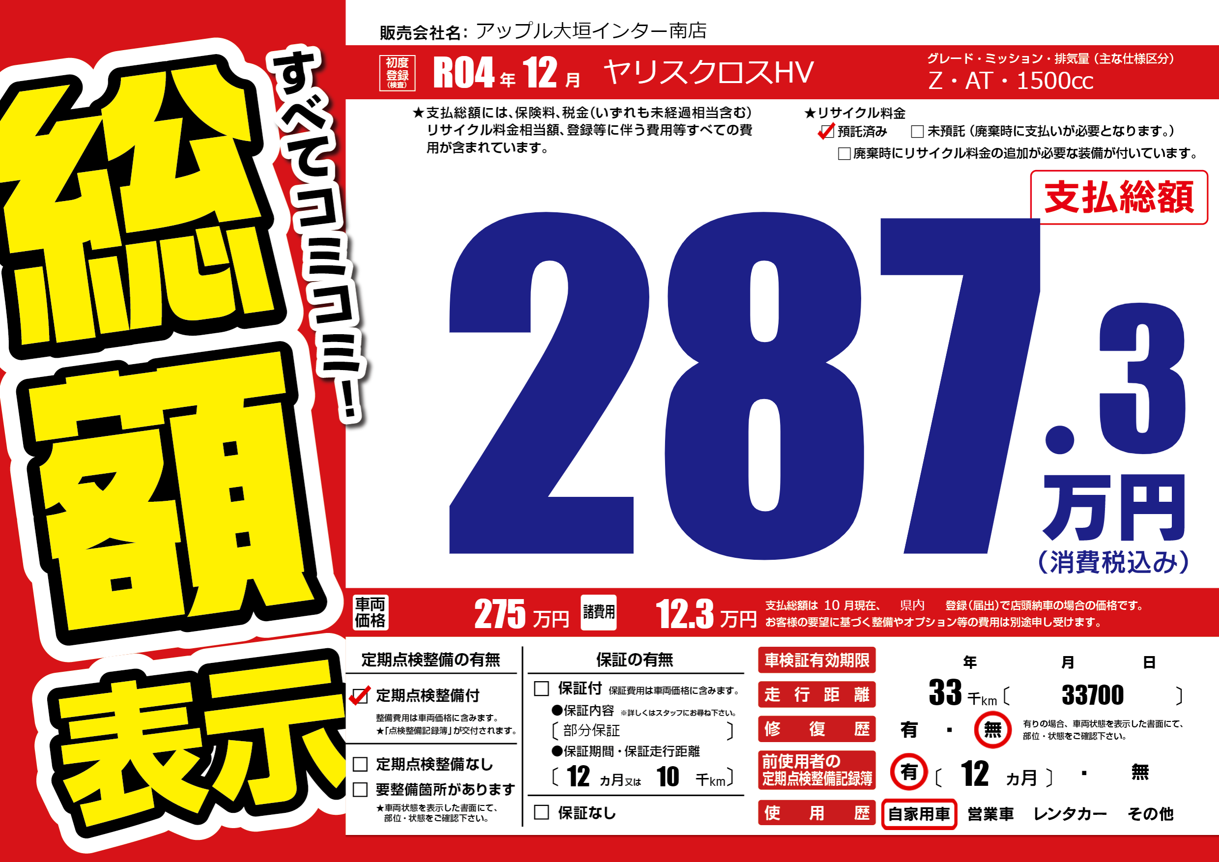 | 車名 | ヤリスクロスHV | グレード ミッション 排気量 |