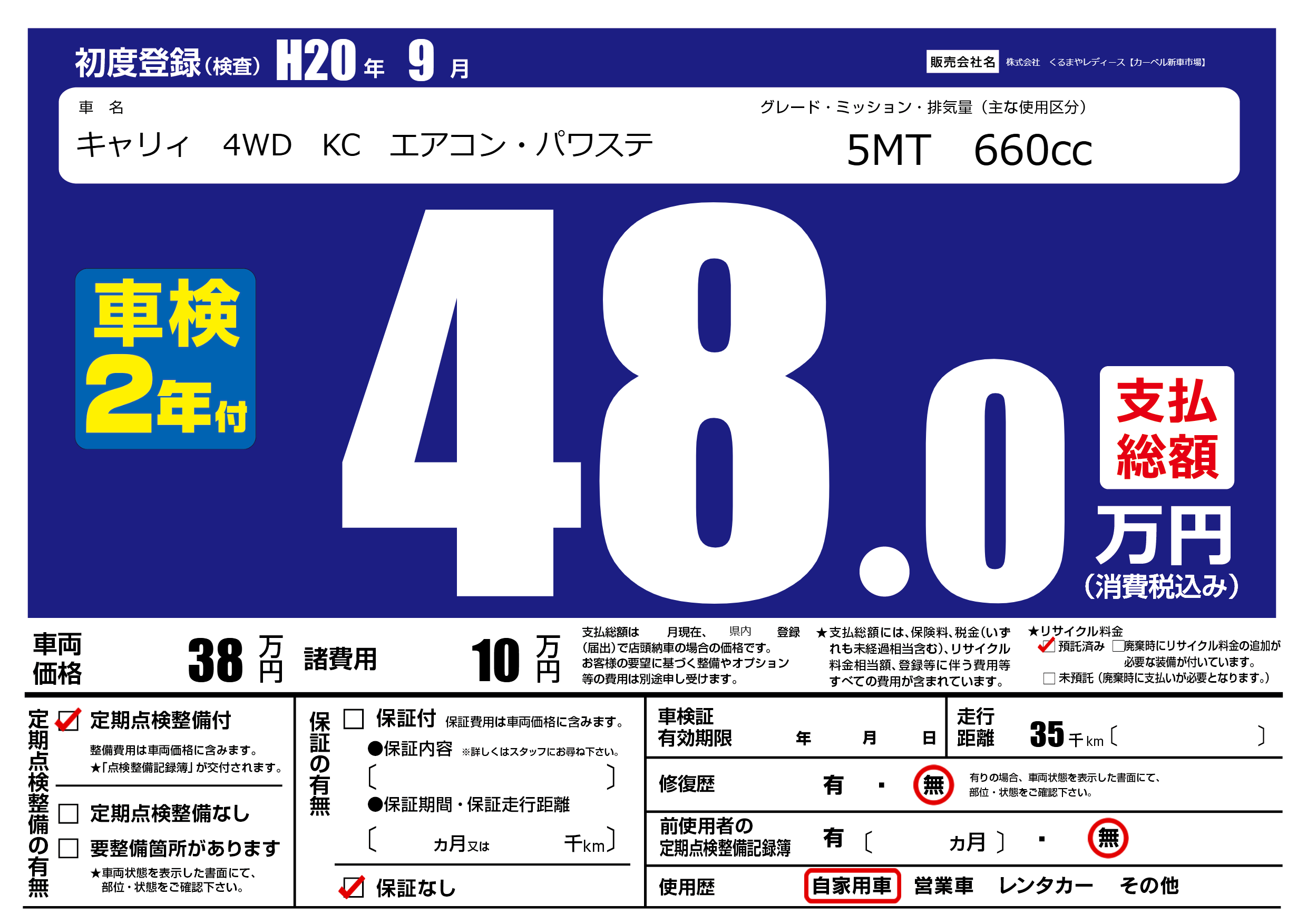 | 走行キロ | 3.5万km | 初年度登録 | H20年9月 |