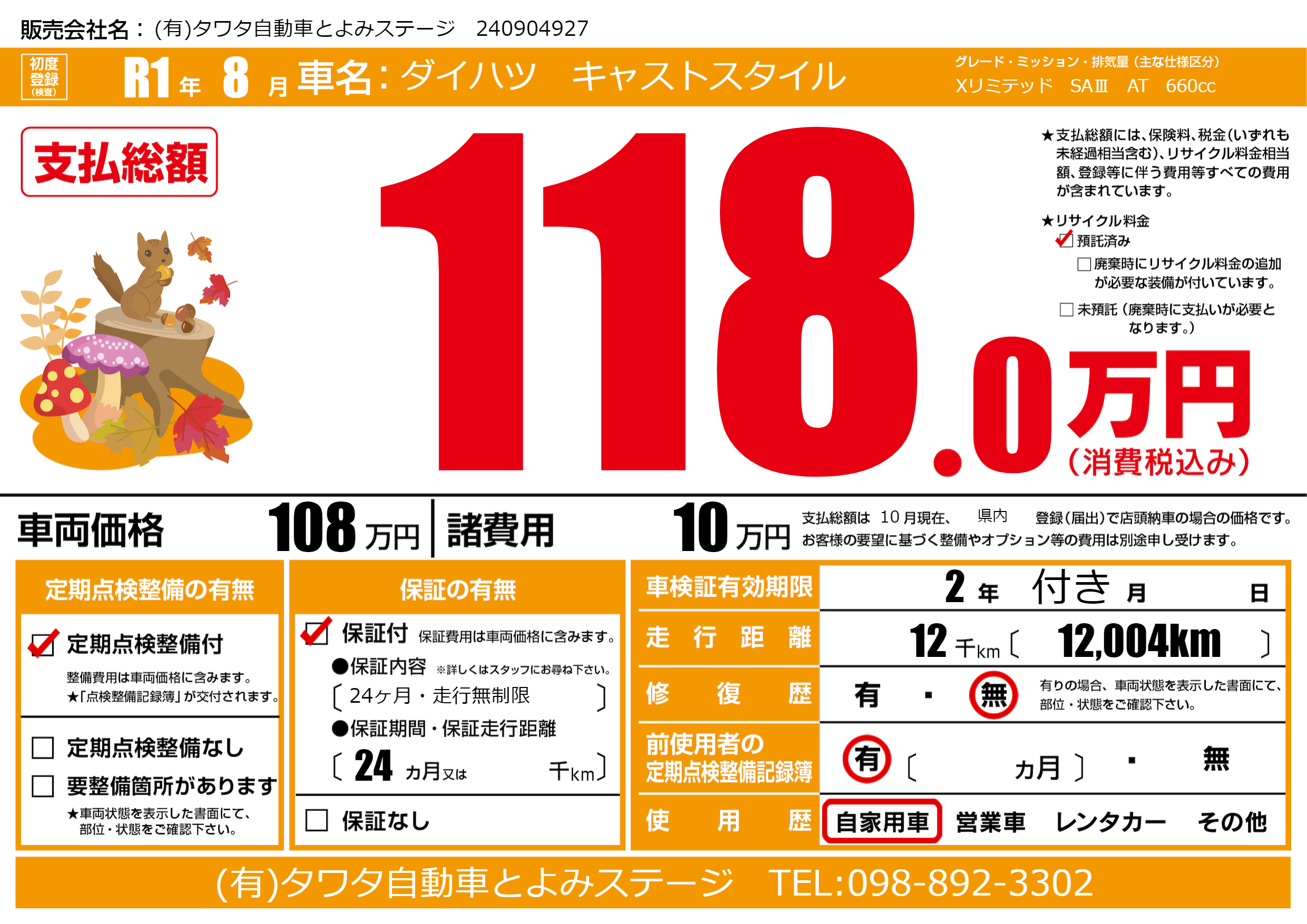 | 走行キロ | 1.2万km | 初年度登録 | R1年8月 |