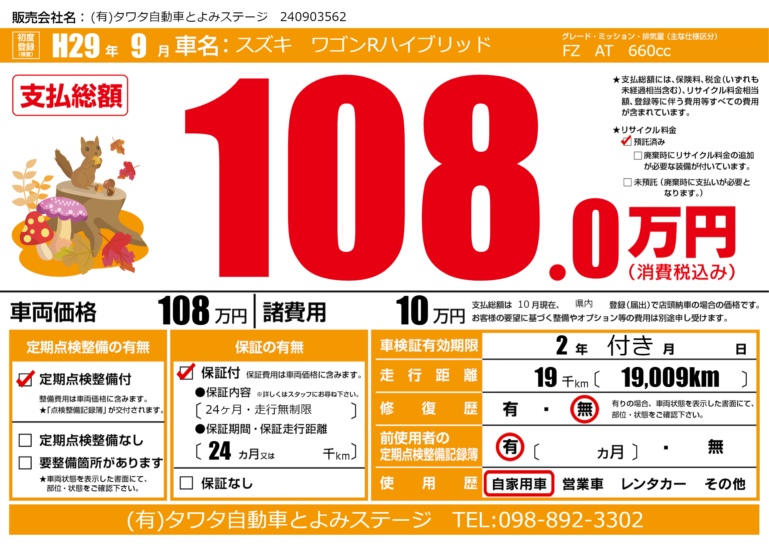 | 車名 | スズキ ワゴンRハイブリッド | グレード ミッション 排気量 |