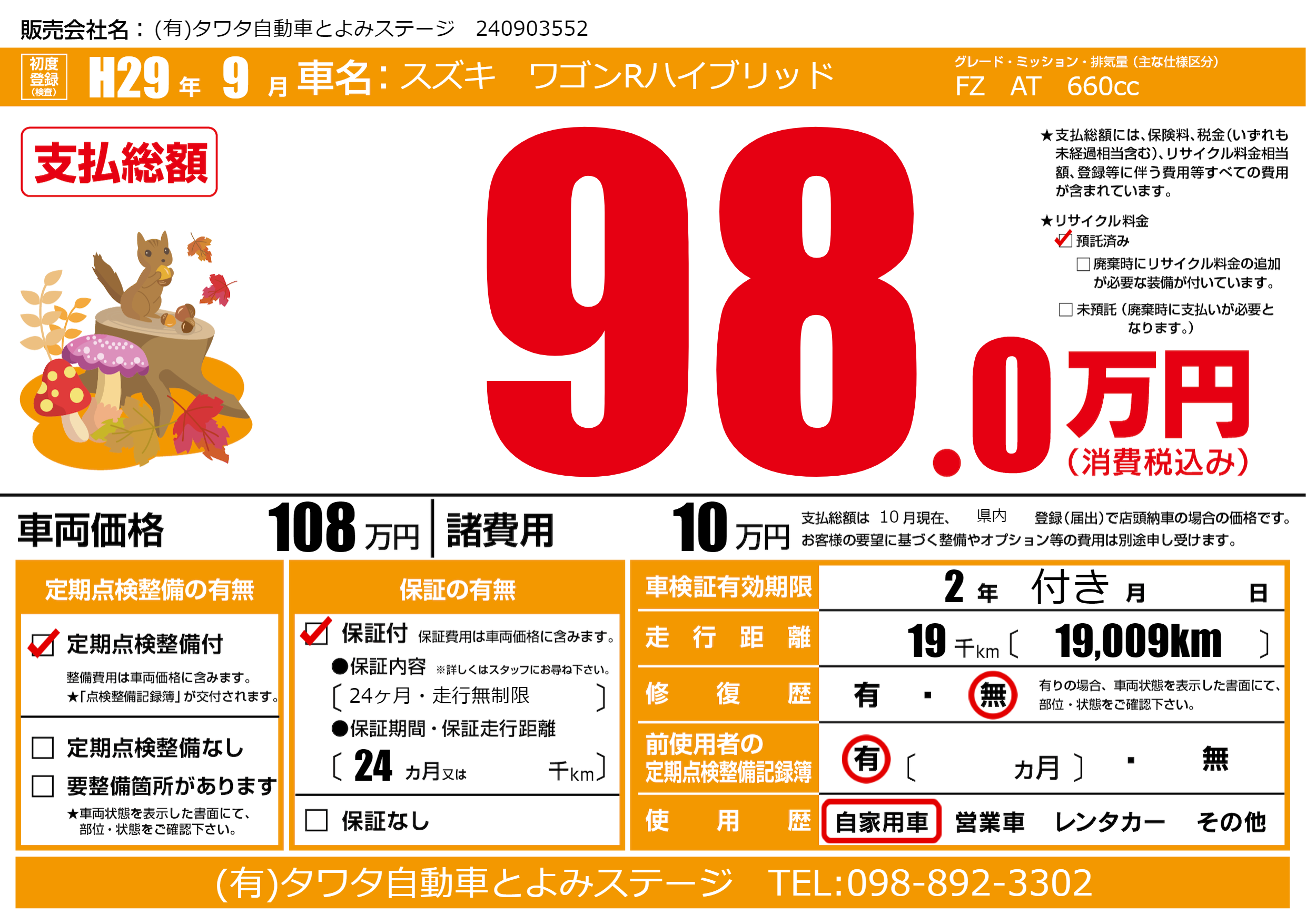 | 車名 | スズキ ワゴンRハイブリッド | グレード ミッション 排気量 |