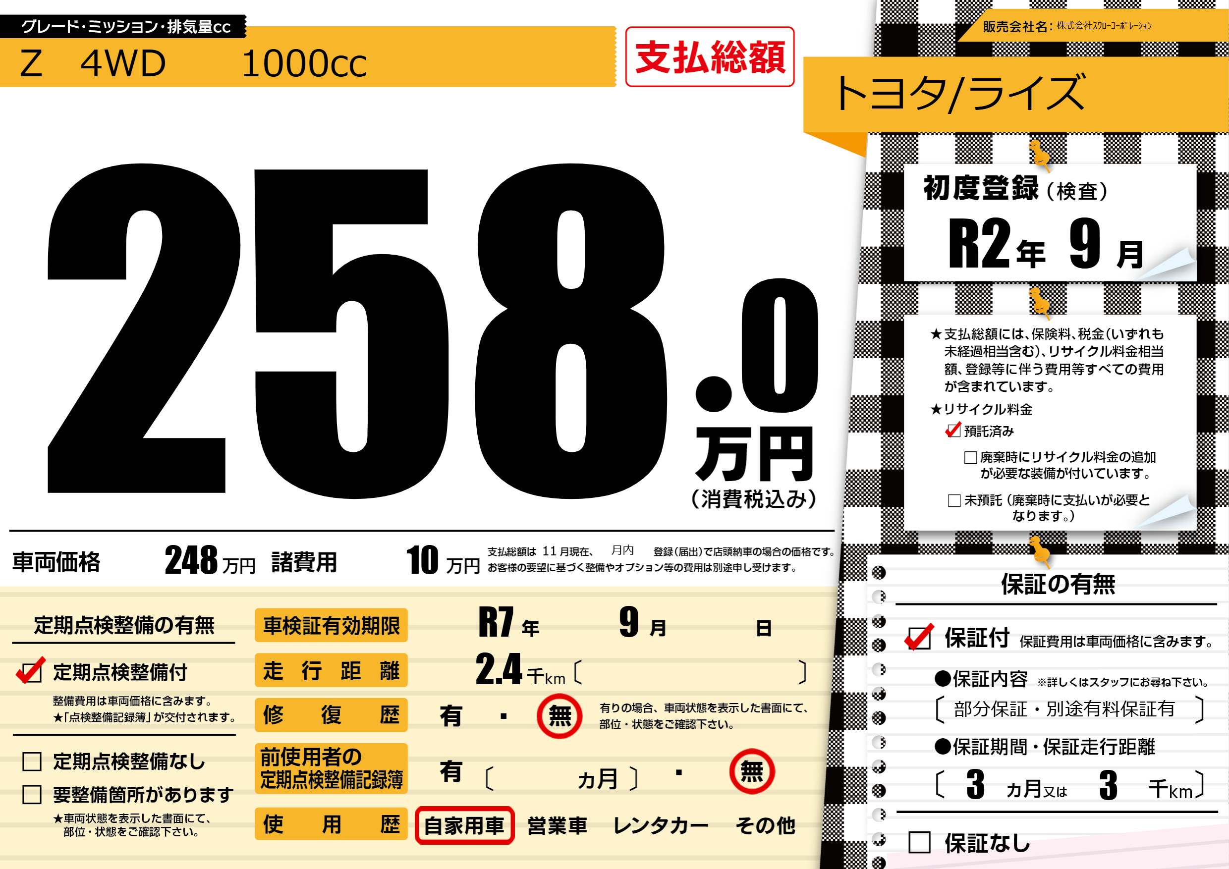 | 車検制限 | R7年 9月 - 日 | ||