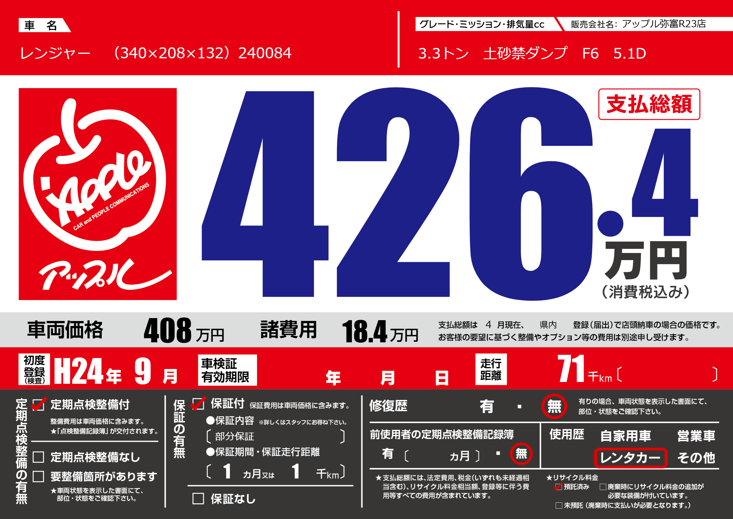 | 走行キロ | 7.1万km | 初年度登録 | H24年9月 |