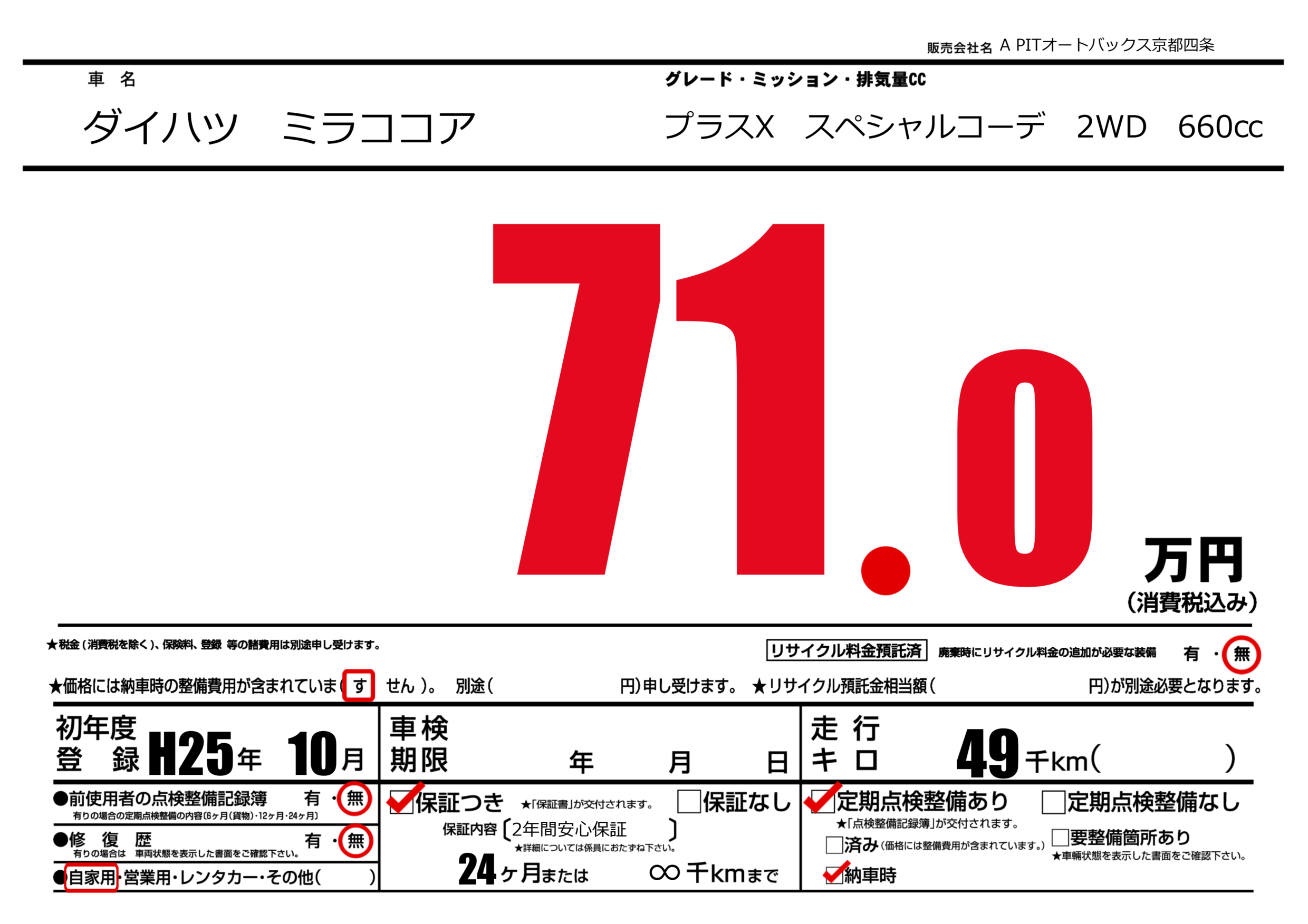 | 走行キロ | 4.9万km | 初年度登録 | H25年10月 |