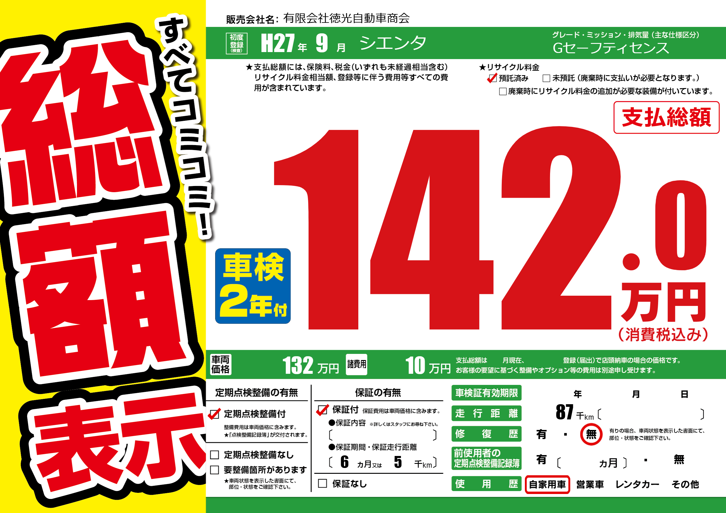 | 車名 | シエンタ | グレード ミッション 排気量 |